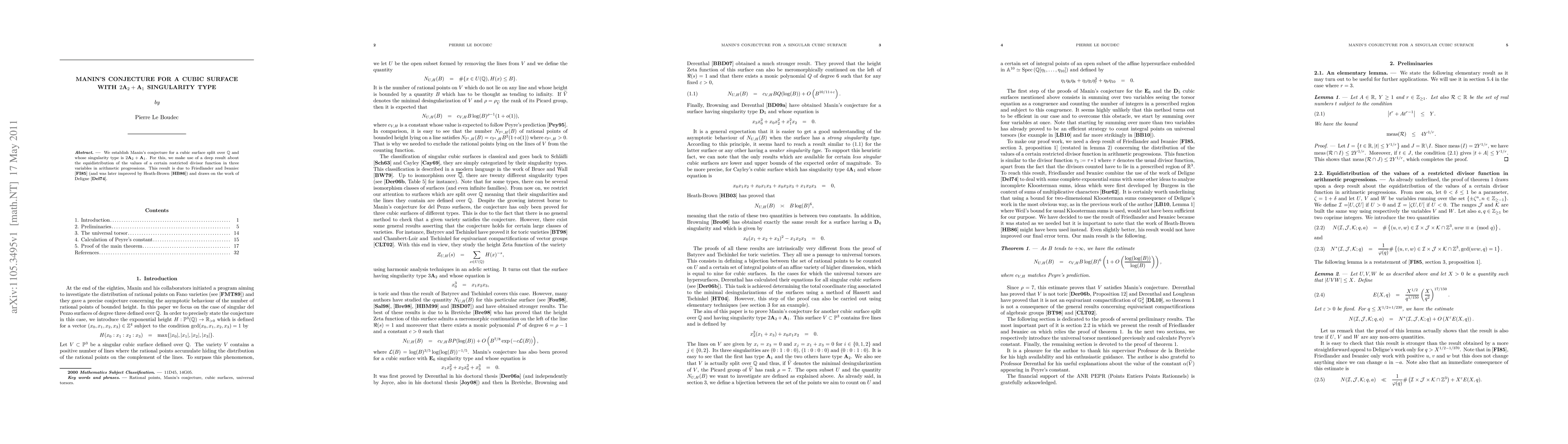Summary: This paper establishes Manin's conjecture for a cubic surface with a specific singularity type over the rational numbers, leveraging a result on the equidistribution of a restricted divisor function in arithmetic progressions, which builds on foundational work by Friedlander, Iwaniec, Heath-Brown, and Deligne.
