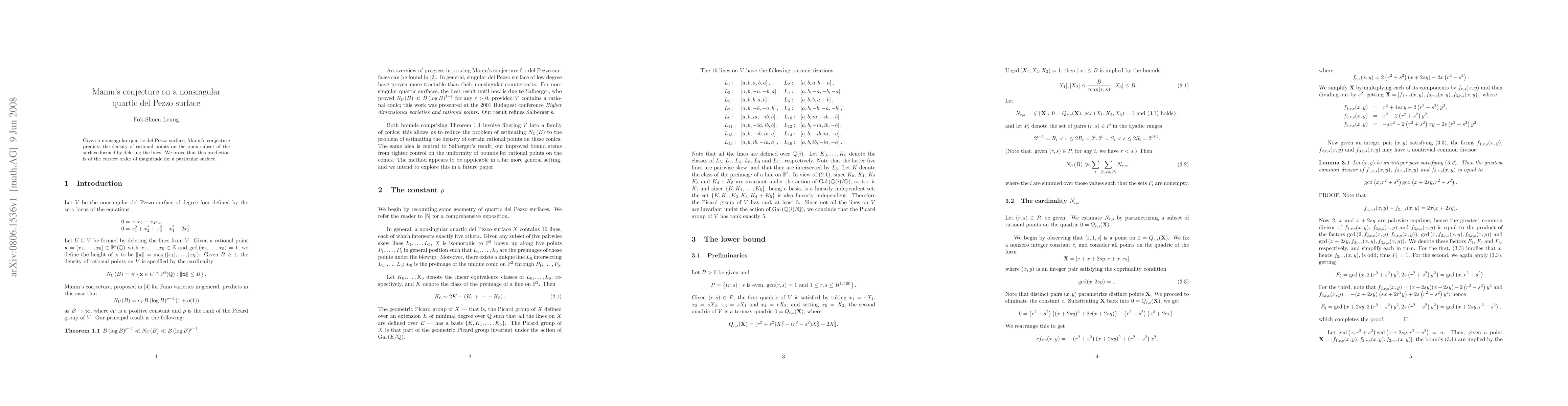 Summary: Manin's conjecture on the density of rational points on a nonsingular quartic del Pezzo surface is proven to have the correct order of magnitude for a specific surface, confirming the prediction on the open subset formed by removing lines.
