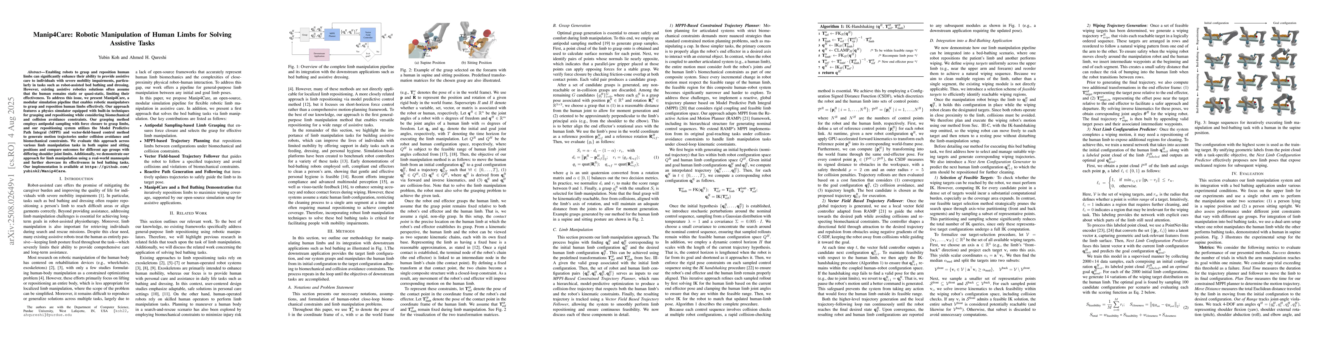 Enabling robots to grasp and reposition human limbs can significantly enhance their ability to provide assistive care to individuals with severe mobility impairments, particularly in tasks such as robot-assisted bed bathing and dressing. However, existing assistive robotics solutions often assume that the human remains static or quasi-static, limiting their effectiveness. To address this issue, we present Manip4Care, a modular simulation pipeline that enables robotic manipulators to grasp and reposition human limbs effectively. Our approach features a physics simulator equipped with built-in techniques for grasping and repositioning while considering biomechanical and collision avoidance constraints. Our grasping method employs antipodal sampling with force closure to grasp limbs, and our repositioning system utilizes the Model Predictive Path Integral (MPPI) and vector-field-based control method to generate motion trajectories under collision avoidance and biomechanical constraints. We evaluate this approach across various limb manipulation tasks in both supine and sitting positions and compare outcomes for different age groups with differing shoulder joint limits. Additionally, we demonstrate our approach for limb manipulation using a real-world mannequin and further showcase its effectiveness in bed bathing tasks.