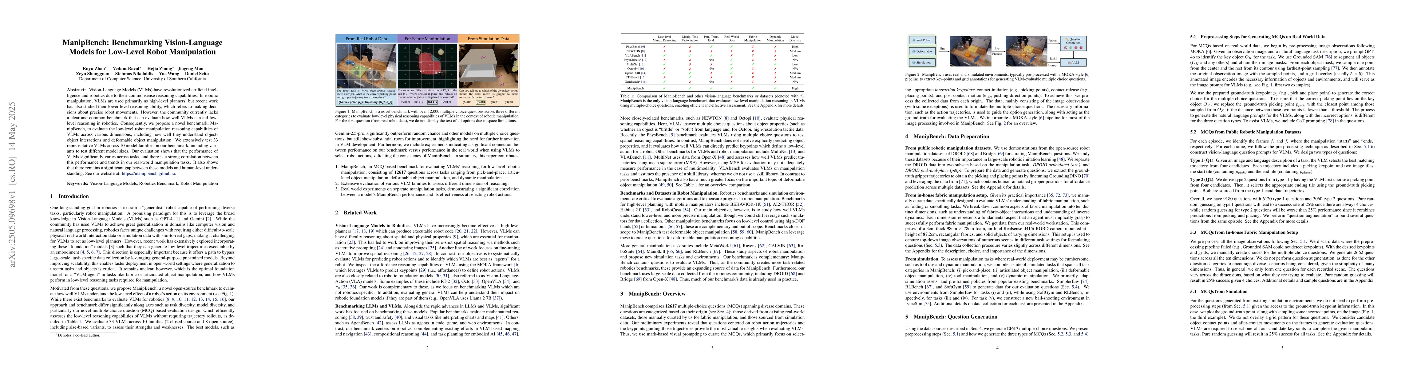 The paper proposes ManipBench, a benchmark to evaluate Vision-Language Models (VLMs) for low-level robot manipulation reasoning, testing their understanding of object-object interactions and deformable object manipulation across 10 model families with 33 representative VLMs.