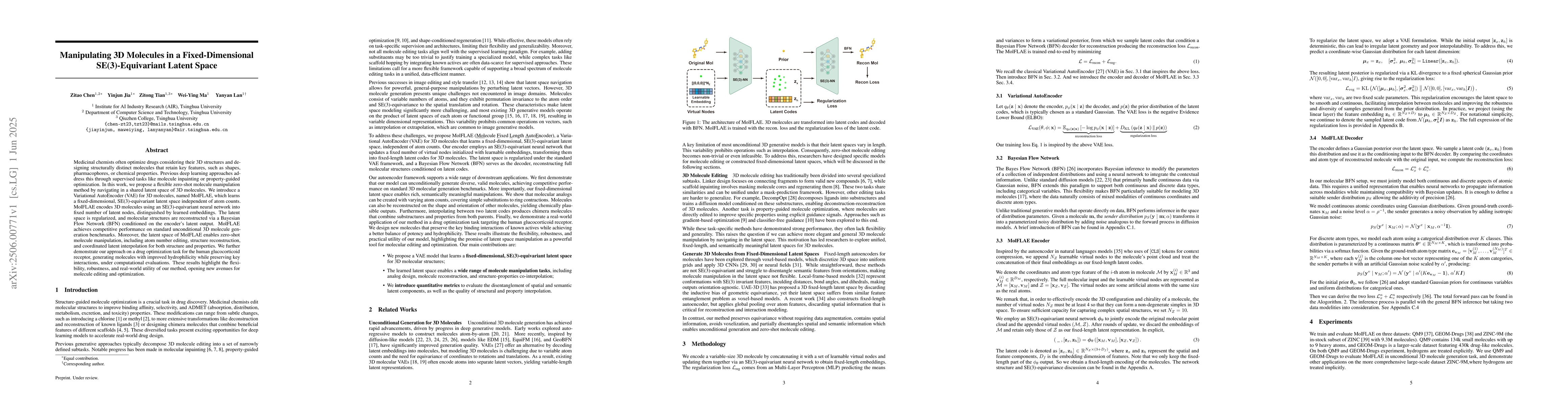 The research introduces MolFLAE, a Variational AutoEncoder (VAE) for 3D molecules that learns a fixed-dimensional, SE(3)-equivariant latent space using an SE(3)-equivariant neural network for encoding. Molecular structures are reconstructed via a Bayesian Flow Network (BFN) conditioned on the encoder's latent output.