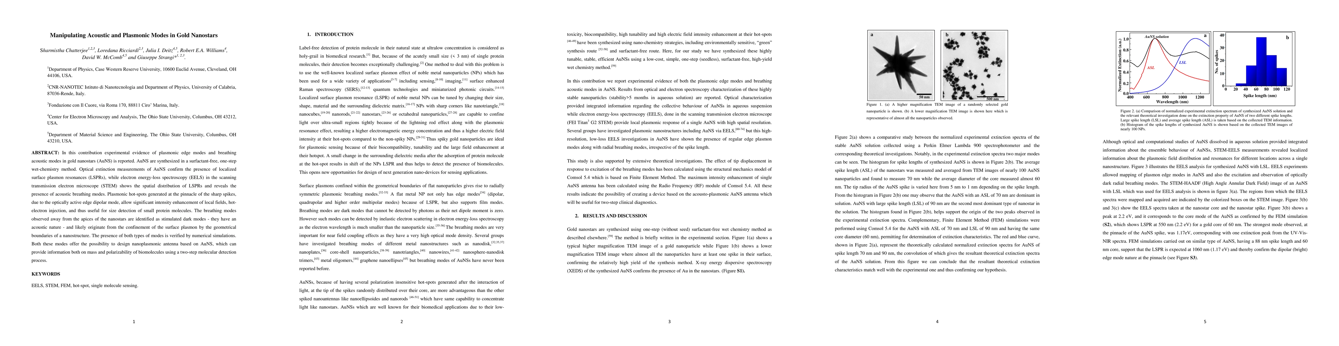 This paper reports on the synthesis of gold nanostars via a surfactant-free method, revealing localized surface plasmon resonances and acoustic breathing modes via optical and electron microscopy. The study demonstrates the potential of these modes for enhancing local fields and detecting small protein molecules, with implications for designing nanoplasmonic antennas for biomolecular detection.