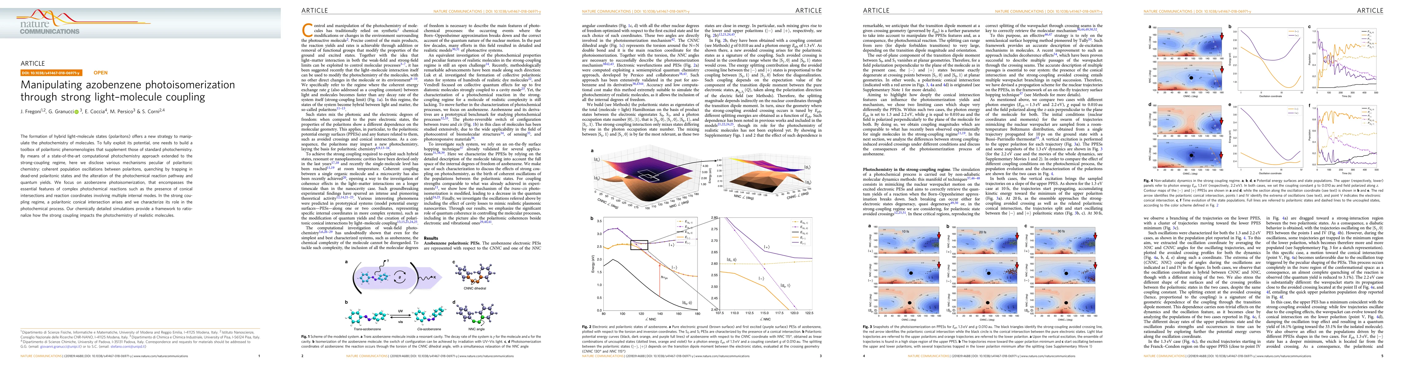 The formation of hybrid light-molecule states (polaritons) offers a new strategy to manipulate the photochemistry of molecules. To fully exploit its potential, one needs to build a toolbox of polaritonic phenomenologies that supplement those of standard photochemistry. By means of a state-of-the-art computational photochemistry approach extended to the strong-coupling regime, here we disclose various mechanisms peculiar of polaritonic chemistry: coherent population oscillations between polaritons, quenching by trapping in dead-end polaritonic states and the alteration of the photochemical reaction pathway and quantum yields. We focus on azobenzene photoisomerization, that encompasses the essential features of complex photochemical reactions such as the presence of conical intersections and reaction coordinates involving multiple internal modes. In the strong coupling regime, a polaritonic conical intersection arises and we characterize its role in the photochemical process. Our chemically detailed simulations provide a framework to rationalize how the strong coupling impacts the photochemistry of realistic molecules