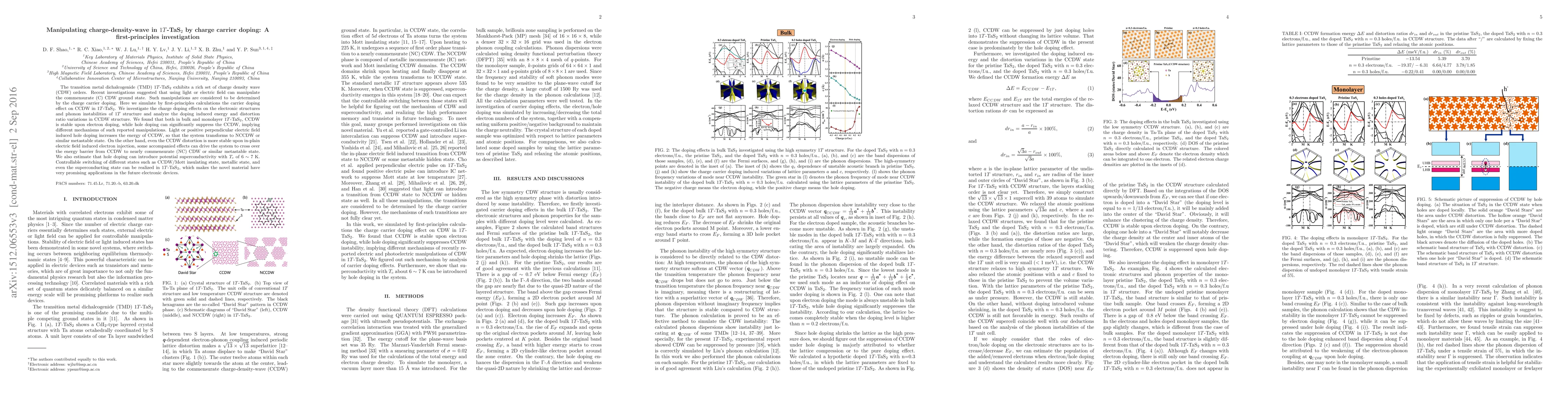 The transition metal dichalcogenide (TMD) $1T$-TaS$_{2}$ exhibits a rich set of charge density wave (CDW) orders. Recent investigations suggested that using light or electric field can manipulate the commensurate (C) CDW ground state. Such manipulations are considered to be determined by the charge carrier doping. Here we simulate by first-principles calculations the carrier doping effect on CCDW in $1T$-TaS$_{2}$. We investigate the charge doping effects on the electronic structures and phonon instabilities of $1T$ structure and analyze the doping induced energy and distortion ratio variations in CCDW structure. We found that both in bulk and monolayer $1T$-TaS$_{2}$, CCDW is stable upon electron doping, while hole doping can significantly suppress the CCDW, implying different mechanisms of such reported manipulations. Light or positive perpendicular electric field induced hole doping increases the energy of CCDW, so that the system transforms to NCCDW or similar metastable state. On the other hand, even the CCDW distortion is more stable upon in-plain electric field induced electron injection, some accompanied effects can drive the system to cross over the energy barrier from CCDW to nearly commensurate (NC) CDW or similar metastable state. We also estimate that hole doping can introduce potential superconductivity with $T_{c}$ of $6\sim7$ K. Controllable switching of different states such as CCDW/Mott insulating state, metallic state, and even the superconducting state can be realized in $1T$-TaS$_{2}$, which makes the novel material have very promising applications in the future electronic devices.