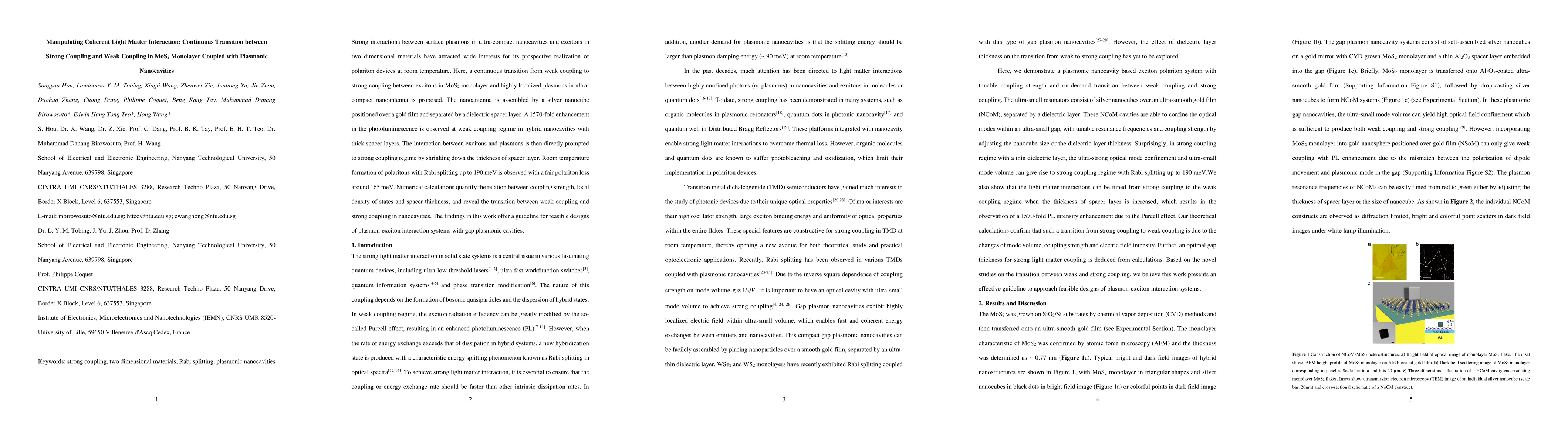 This paper details the manipulation of coherent light-matter interaction in MoS2 monolayer coupled with plasmonic nanocavities, showing a continuous transition from weak to strong coupling by adjusting the dielectric spacer layer thickness. A 1570-fold photoluminescence enhancement and room-temperature polariton formation with a 190 meV Rabi splitting were achieved, providing insights for designing efficient plasmon-exciton interaction systems.