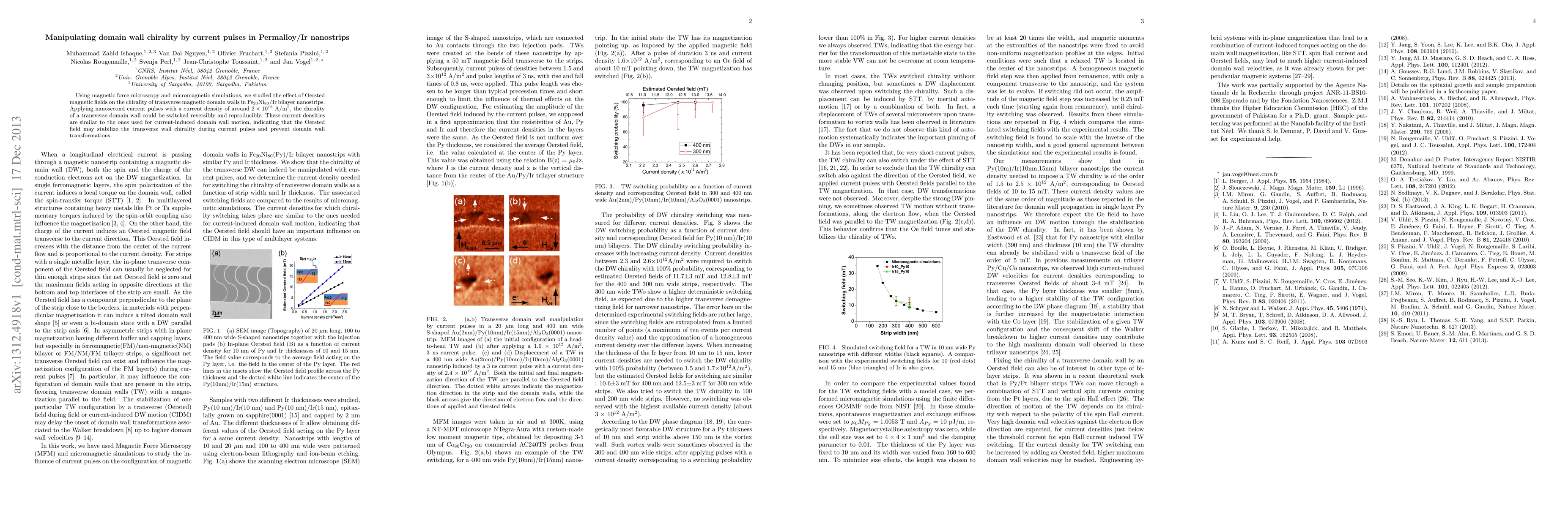 This paper investigates how nanosecond current pulses affect the chirality of transverse magnetic domain walls in Fe$_{20}$Ni$_{80}$/Ir nanostrips, revealing reversible switching facilitated by the Oersted magnetic field, and suggesting that it stabilizes the wall chirality during current-induced motion.