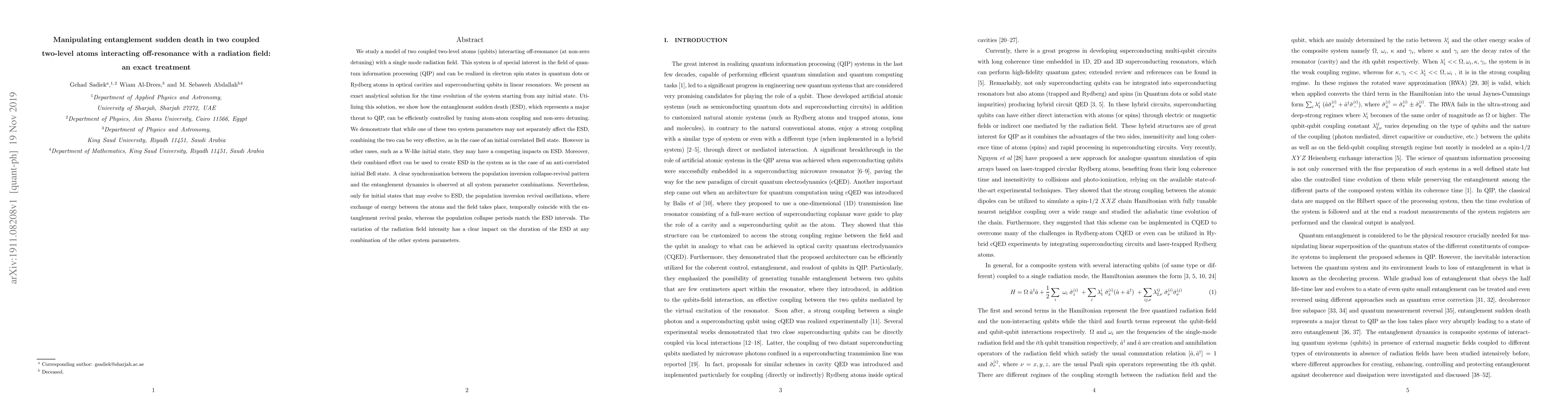 This paper presents an exact analytical solution for the time evolution of two coupled qubits interacting off-resonance with a single-mode radiation field, revealing how entanglement sudden death (ESD) can be controlled by tuning atom-atom coupling and detuning. The study shows that combining these parameters can either enhance or compete with ESD, depending on the initial state, and highlights the synchronization between population inversion dynamics and entanglement revival.
