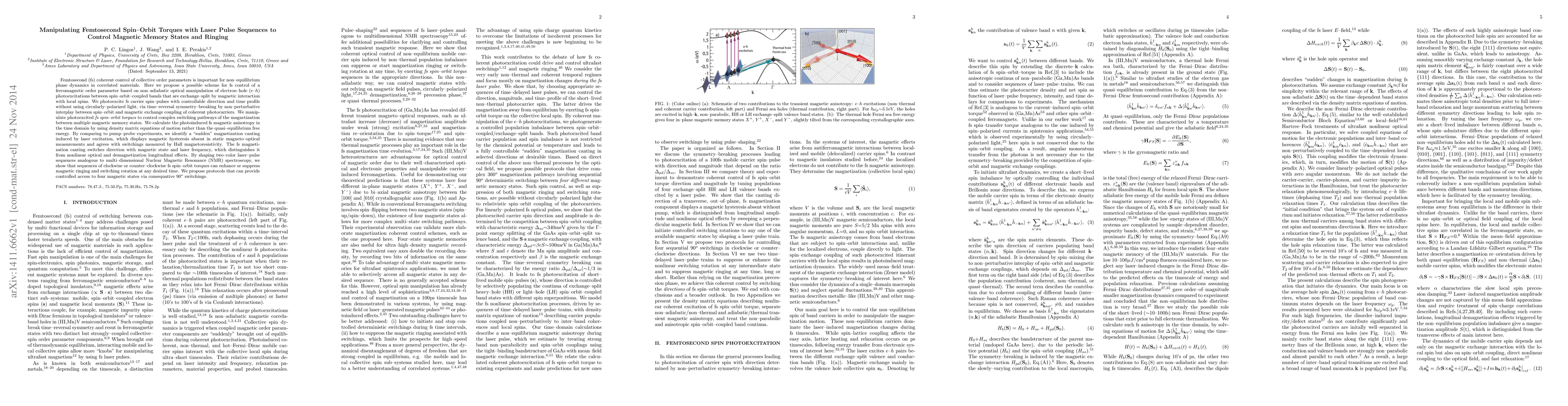 Femtosecond (fs) coherent control of collective order parameters is important for non--equilibrium phase dynamics in correlated materials. Here we propose a possible scheme for fs control of a ferromagnetic order parameter based on non--adiabatic optical manipulation of electron--hole ($e$--$h$) photoexcitations between spin--orbit--coupled bands that are exchange--split by magnetic interaction with local spins. We photoexcite fs carrier spin--pulses with controllable direction and time profile without using circularly--polarized light, via time--reversal symmetry--breaking by non--perturbative interplay between spin--orbit and magnetic exchange coupling of coherent photocarriers. We manipulate photoexcited {\em fs spin--orbit torques} to control complex switching pathways of the magnetization between multiple magnetic memory states. We calculate the photoinduced fs magnetic anisotropy in the time domain by using density matrix equations of motion rather than the quasi--equilibrium free energy. By comparing to pump--probe experiments, we identify a "sudden" magnetization canting induced by laser excitation, which displays magnetic hysteresis absent in static magneto--optical measurements and agrees with switchings measured by Hall magnetoresistivity. The fs magnetization canting switches direction with magnetic state and laser frequency, which distinguishes it from nonlinear optical and demagnetization longitudinal effects. By shaping two--color laser--pulse sequences analogous to multi--dimensional Nuclear Magnetic Resonance (NMR) spectroscopy, we show that sequences of clockwise or counter--clockwise fs spin--orbit torques can enhance or suppress magnetic ringing and switching rotation at any desired time. We propose protocols that can provide controlled access to four magnetic states via consequative 90$^{o}$ switchings.