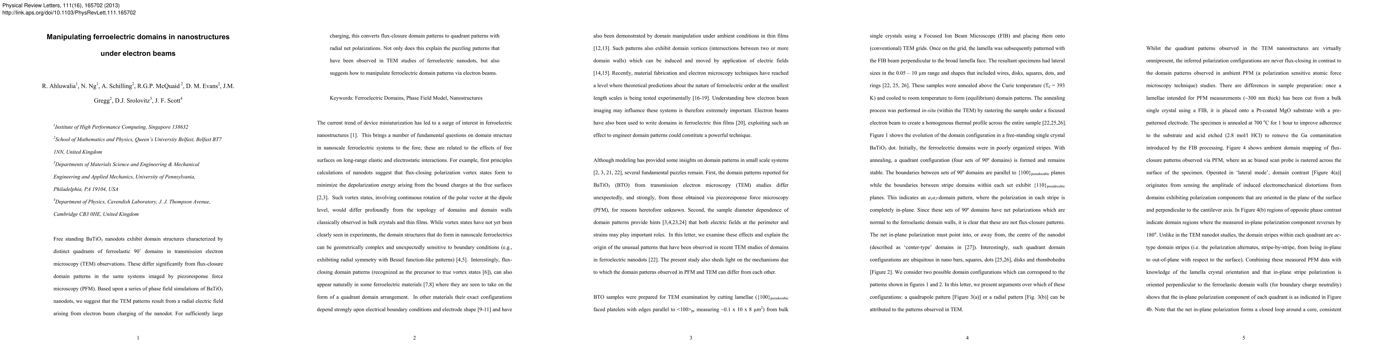This paper explores the domain structures in BaTiO3 nanodots under electron beams, revealing that TEM patterns arise from radial electric fields due to electron beam charging, converting flux-closure domains to quadrant patterns. This insight provides a method for manipulating ferroelectric domain patterns using electron beams.
