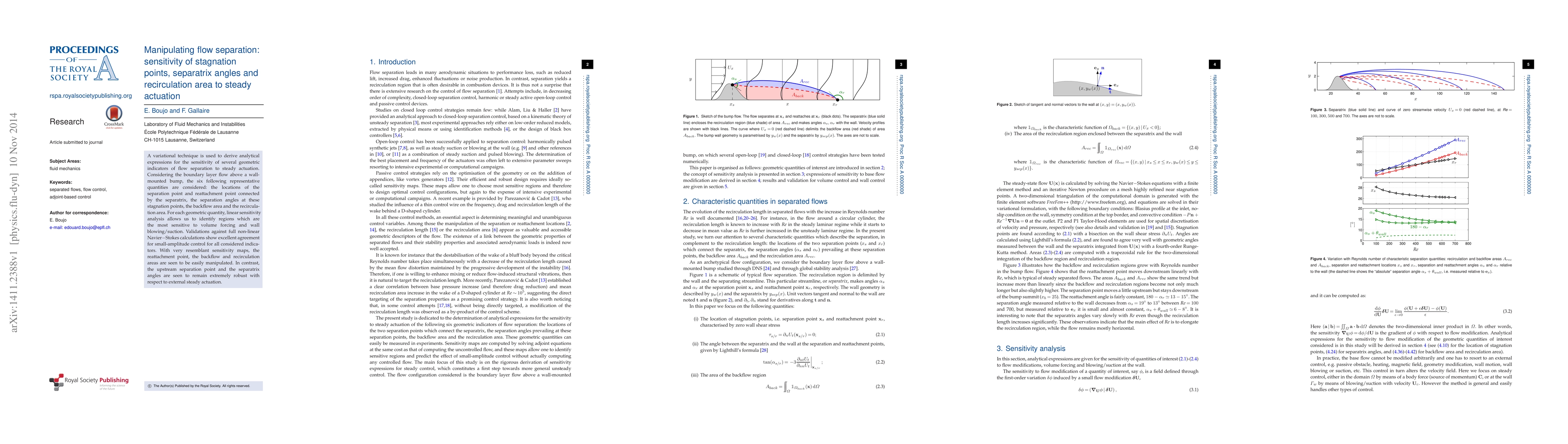 This paper uses a variational technique to derive analytical expressions for the sensitivity of flow separation indicators to steady actuation, focusing on a boundary layer flow above a wall-mounted bump. The study identifies regions most sensitive to actuation, showing that the reattachment point, backflow, and recirculation areas are easily manipulated, while the upstream separation point and separatrix angles remain robust.