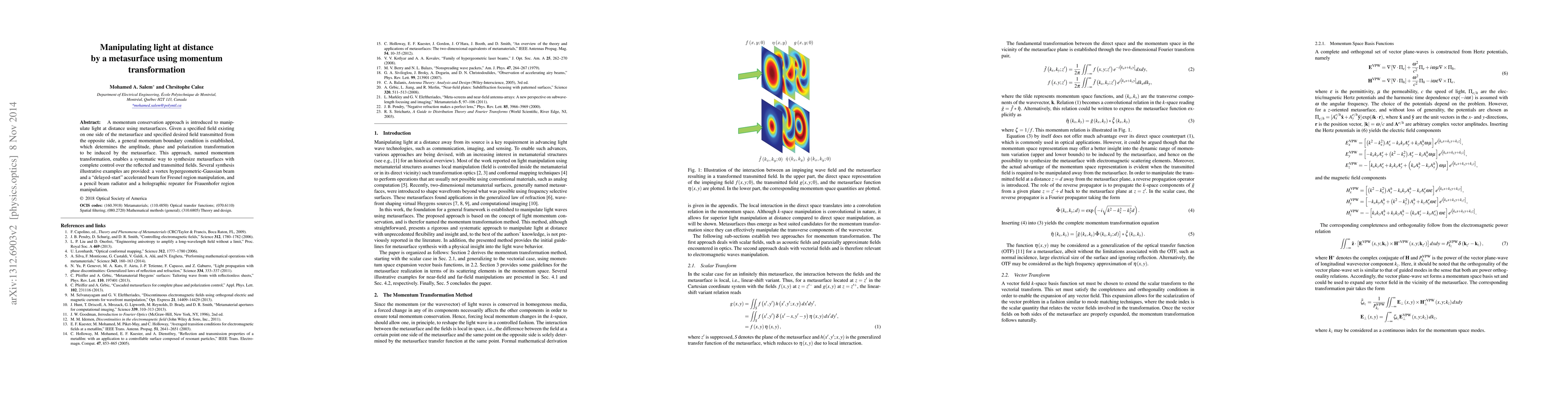 A momentum conservation approach is introduced to manipulate light at distance using metasurfaces. Given a specified field existing on one side of the metasurface and specified desired field transmitted from the opposite side, a general momentum boundary condition is established, which determines the amplitude, phase and polarization transformation to be induced by the metasurface. This approach, named momentum transformation, enables a systematic way to synthesize metasurfaces with complete control over the reflected and transmitted fields. Several synthesis illustrative examples are provided: a vortex hypergeometric-Gaussian beam and a "delayed-start" accelerated beam for Fresnel region manipulation, and a pencil beam radiator and a holographic repeater for Frauenhofer region manipulation.