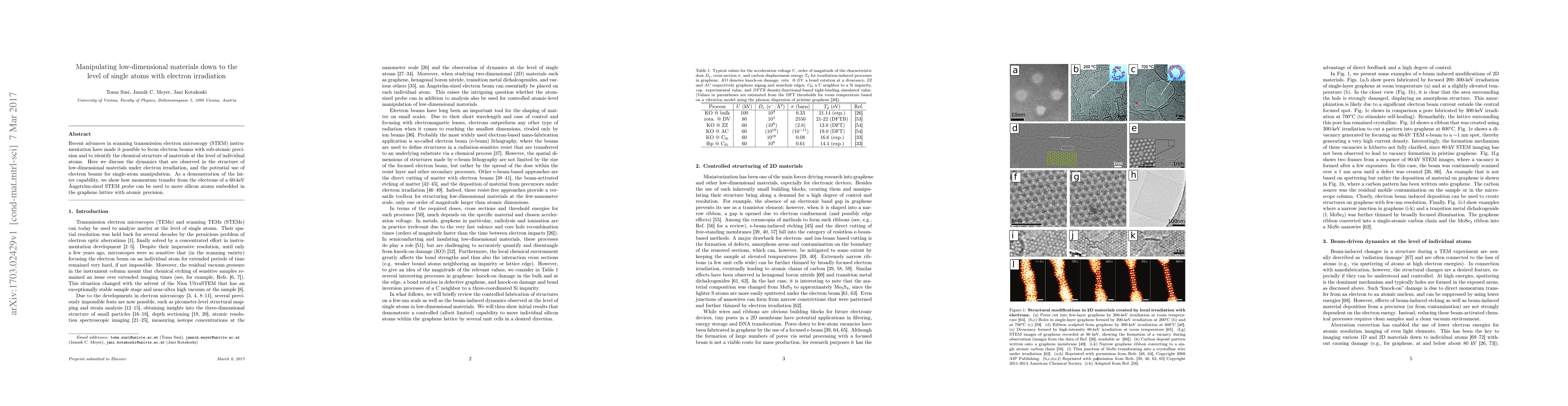 This paper explores the manipulation of low-dimensional materials at the single-atom level using electron irradiation, demonstrating the potential of focused electron beams from advanced STEM technology to precisely move silicon atoms within a graphene lattice. The study highlights the dynamics and structural changes induced by electron beams in such materials.
