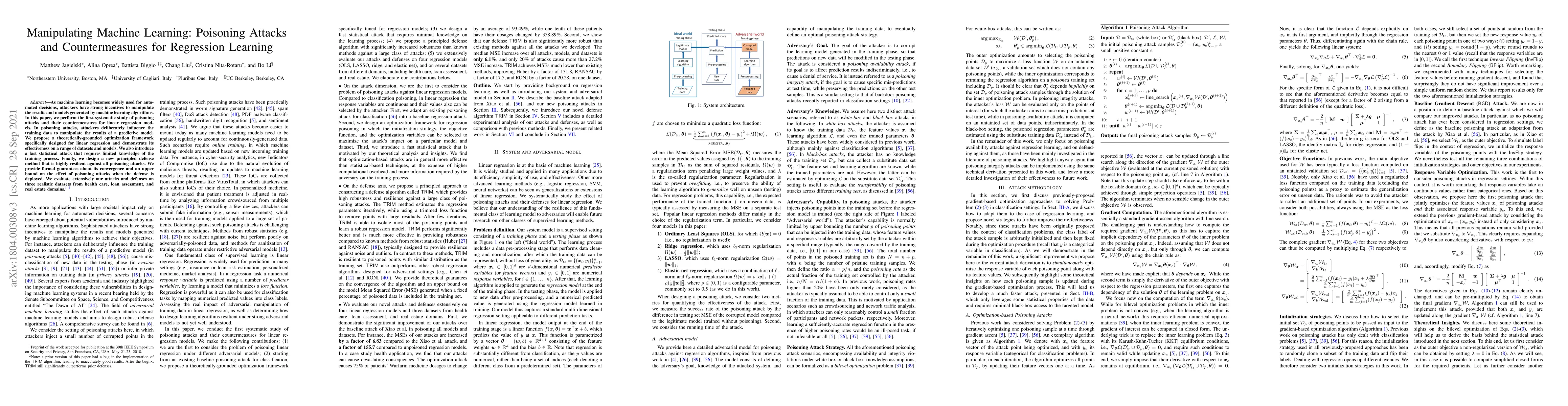 As machine learning becomes widely used for automated decisions, attackers have strong incentives to manipulate the results and models generated by machine learning algorithms. In this paper, we perform the first systematic study of poisoning attacks and their countermeasures for linear regression models. In poisoning attacks, attackers deliberately influence the training data to manipulate the results of a predictive model. We propose a theoretically-grounded optimization framework specifically designed for linear regression and demonstrate its effectiveness on a range of datasets and models. We also introduce a fast statistical attack that requires limited knowledge of the training process. Finally, we design a new principled defense method that is highly resilient against all poisoning attacks. We provide formal guarantees about its convergence and an upper bound on the effect of poisoning attacks when the defense is deployed. We evaluate extensively our attacks and defenses on three realistic datasets from health care, loan assessment, and real estate domains.