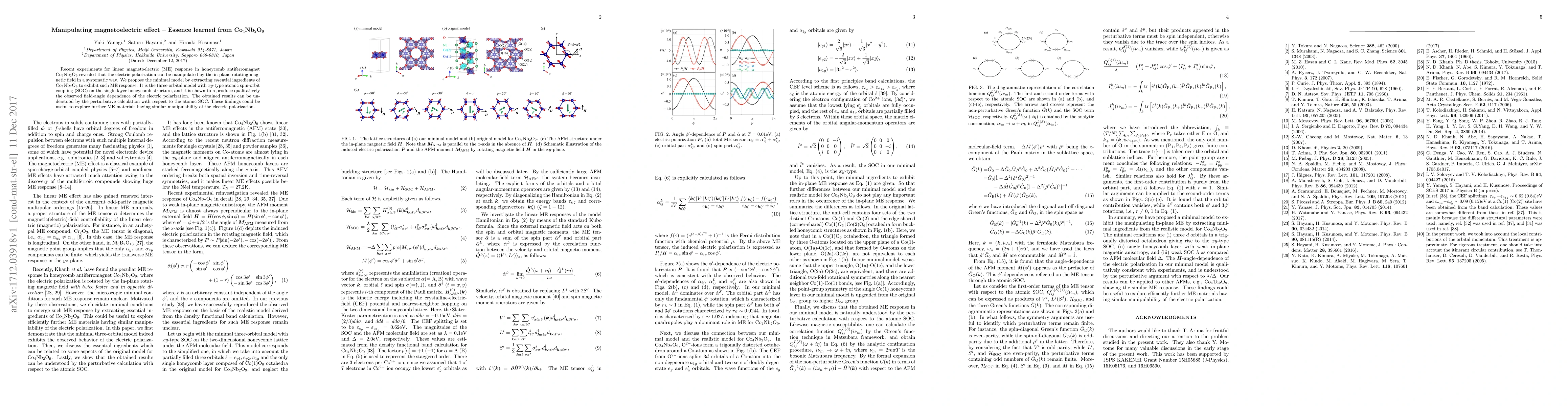This paper investigates the magnetoelectric effect in Co$_4$Nb$_2$O$_9$, demonstrating that electric polarization can be manipulated by an in-plane rotating magnetic field. The study proposes a minimal three-orbital model with $xy$-type atomic spin-orbit coupling to reproduce the observed ME response, providing insights into the manipulability of electric polarization in similar materials.