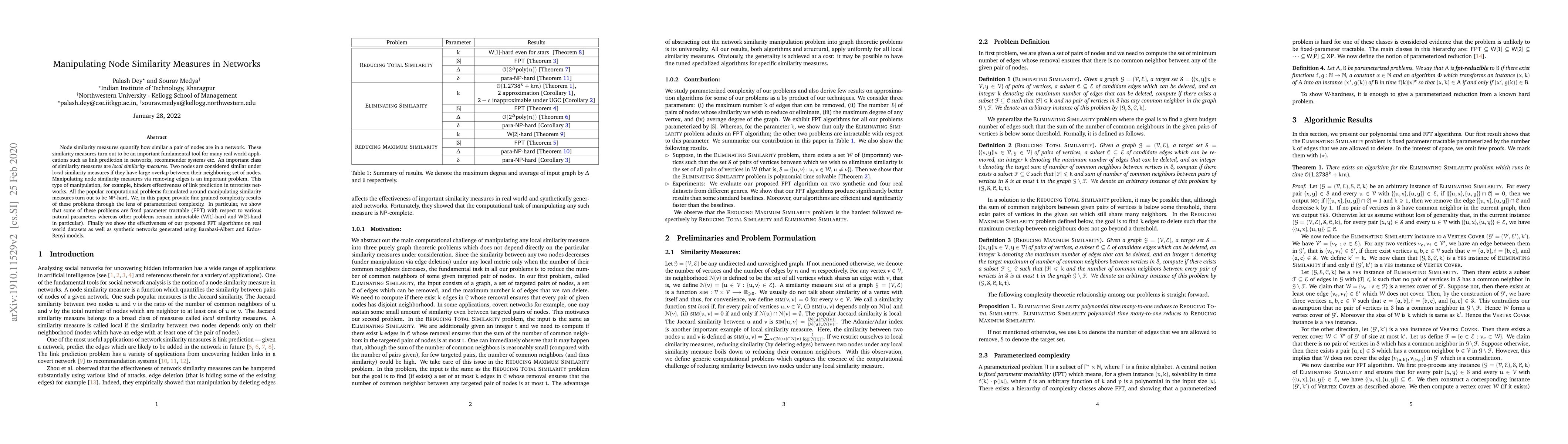This paper investigates the complexity of manipulating node similarity measures in networks, demonstrating that while some problems are fixed parameter tractable (FPT), others remain intractable (W[1]-hard and W[2]-hard). The study proposes FPT algorithms and evaluates their effectiveness on both real and synthetic datasets.
