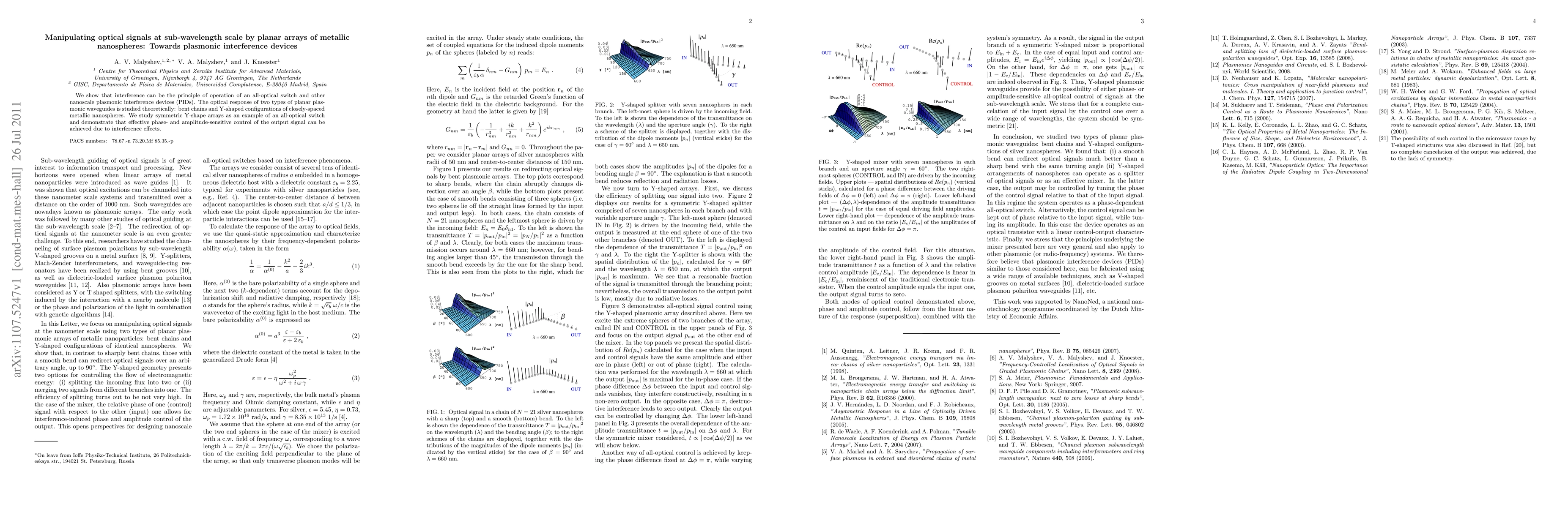 This paper investigates the use of planar arrays of metallic nanospheres to manipulate optical signals via plasmonic interference, demonstrating the potential for all-optical switches and nanoscale plasmonic interference devices. Theoretical analysis of bent chains and Y-shaped configurations shows effective control of output signals through interference effects.