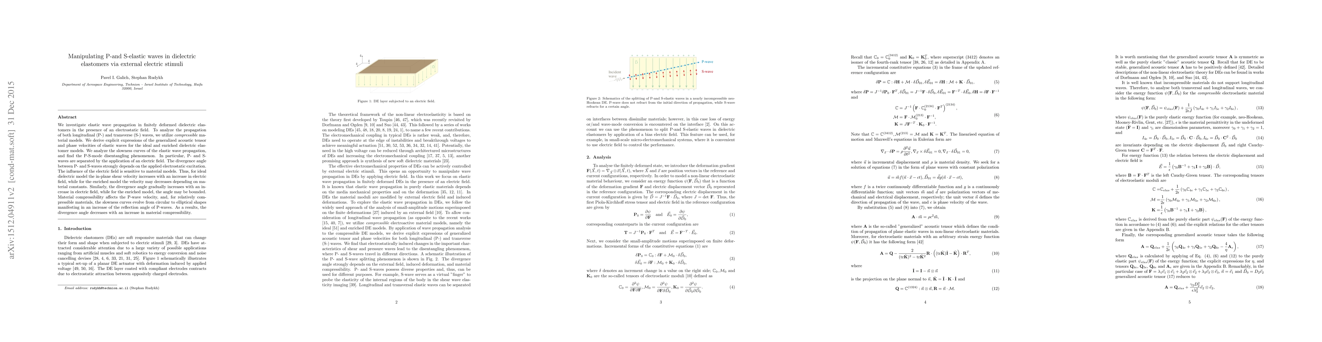 This research explores how electric fields impact the propagation of elastic waves in deformed dielectric elastomers. Key findings include the separation of P- and S-waves by electric fields, with the divergence angle varying based on field strength and material models. Material compressibility influences wave velocity and reflection angles, causing slowness curves to shift from circular to elliptical shapes.