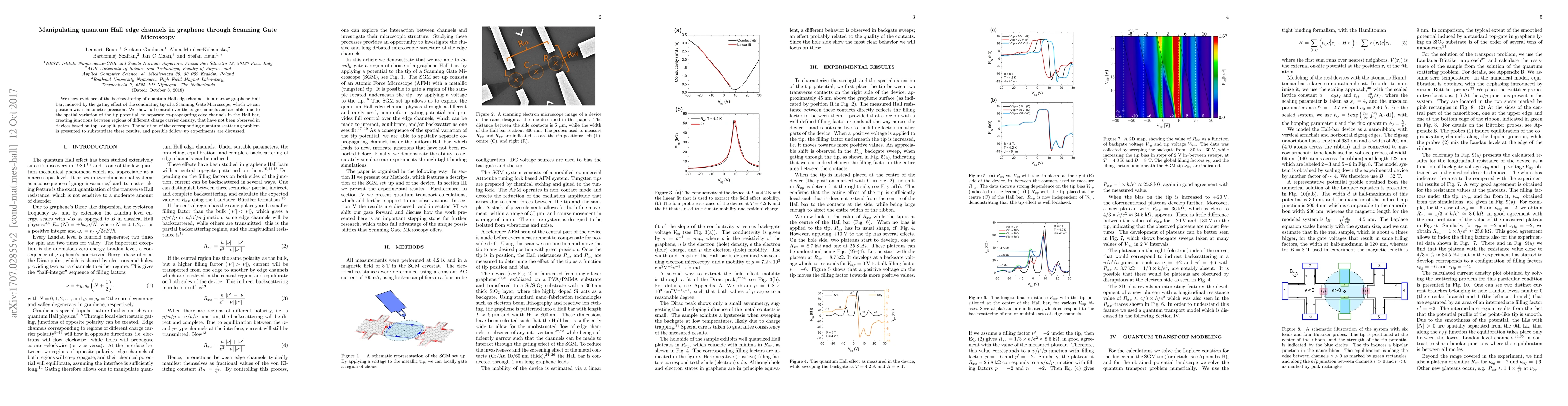 This paper demonstrates the manipulation of quantum Hall edge channels in graphene using Scanning Gate Microscopy, achieving precise control over backscattering and separation of co-propagating channels, facilitated by the spatial variation of the tip potential, with a quantum scattering solution supporting these findings.