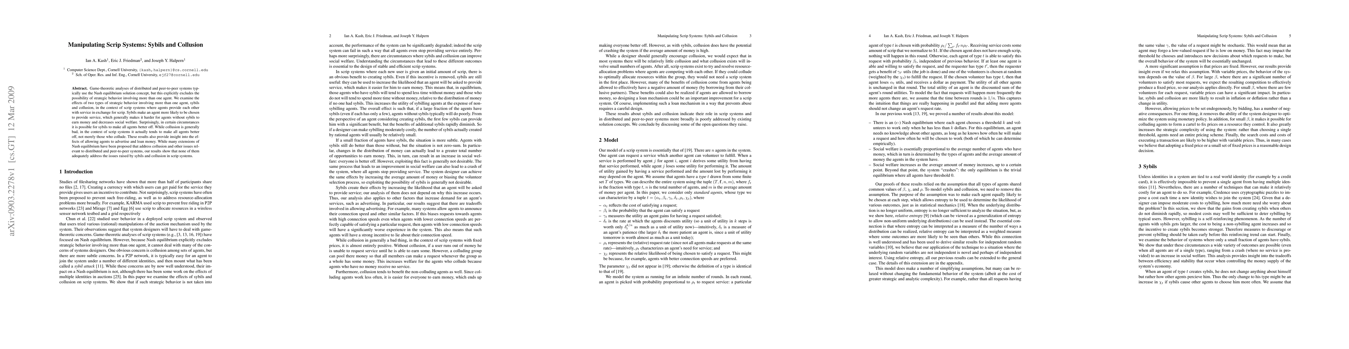 Game-theoretic analyses of distributed and peer-to-peer systems typically use the Nash equilibrium solution concept, but this explicitly excludes the possibility of strategic behavior involving more than one agent. We examine the effects of two types of strategic behavior involving more than one agent, sybils and collusion, in the context of scrip systems where agents provide each other with service in exchange for scrip. Sybils make an agent more likely to be chosen to provide service, which generally makes it harder for agents without sybils to earn money and decreases social welfare. Surprisingly, in certain circumstances it is possible for sybils to make all agents better off. While collusion is generally bad, in the context of scrip systems it actually tends to make all agents better off, not merely those who collude. These results also provide insight into the effects of allowing agents to advertise and loan money. While many extensions of Nash equilibrium have been proposed that address collusion and other issues relevant to distributed and peer-to-peer systems, our results show that none of them adequately address the issues raised by sybils and collusion in scrip systems.