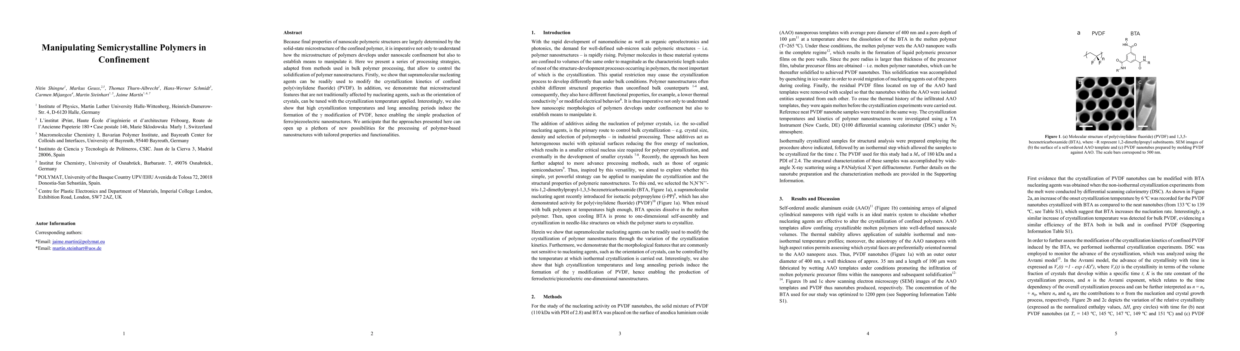 Because final properties of nanoscale polymeric structures are largely determined by the solid-state microstructure of the confined polymer, it is imperative not only to understand how the microstructure of polymers develops under nanoscale confinement but also to establish means to manipulate it. Here we present a series of processing strategies, adapted from methods used in bulk polymer processing, that allow to control the solidification of polymer nanostructures. Firstly, we show that supramolecular nucleating agents can be readily used to modify the crystallization kinetics of confined poly(vinylidene fluoride) (PVDF). In addition, we demonstrate that microstructural features that are not traditionally affected by nucleating agents, such as the orientation of crystals, can be tuned with the crystallization temperature applied. Interestingly, we also show that high crystallization temperatures and long annealing periods induce the formation of the modification of PVDF, hence enabling the simple production of ferro/piezoelectric nanostructures. We anticipate that the approaches presented here can open up a plethora of new possibilities for the processing of polymer-based nanostructures with tailored properties and functionalities.