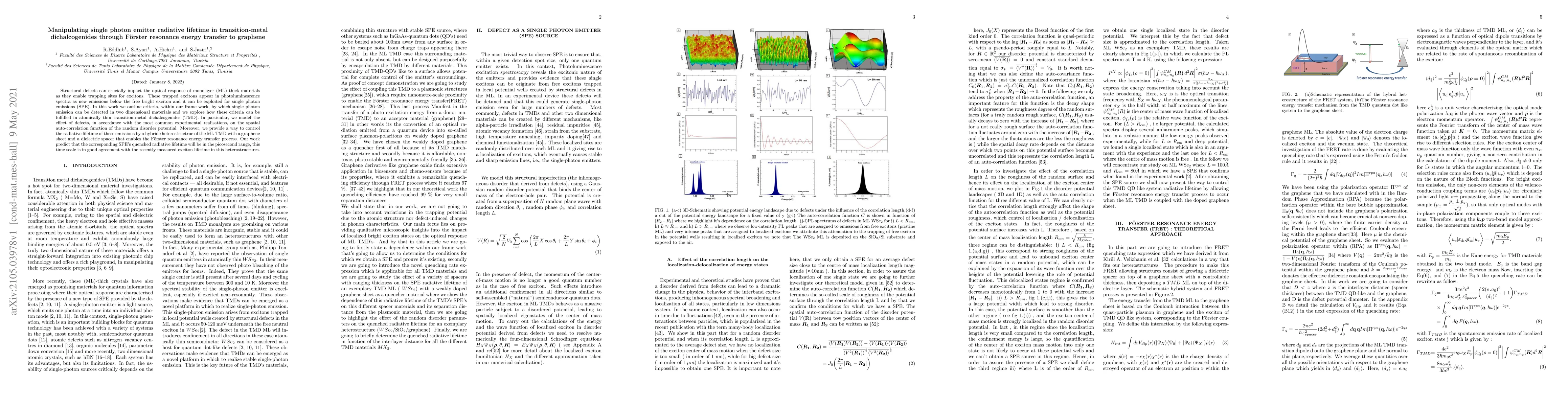 Structural defects can crucially impact the optical response of monolayer (ML) thick materials as they enable trapping sites for excitons. These trapped excitons appear in photoluminescence spectra as new emissions below the free bright exciton and it can be exploited for single photon emissions (SPE). In this work we outline criteria, within our frame work, by which single photon emission can be detected in two dimensional materials and we explore how these criteria can be fulfilled in atomically thin transition metal dichalcogenides (TMD). In particular, we model the effect of defects, in accordance with the most common experimental realisations, on the spatial autocorrelation function of the random disorder potential. Moreover, we provide a way to control the radiative lifetime of these emissions by a hybride heterostructrue of the ML TMD with a graphene sheet and a dielectric spacer that enables the Forster resonance energy transfer process. Our work predict that the corresponding SPE quenched radiative lifetime will be in the picosecond range, this time scale is in good agreement with the recently measured exciton lifetime in this heterostructures