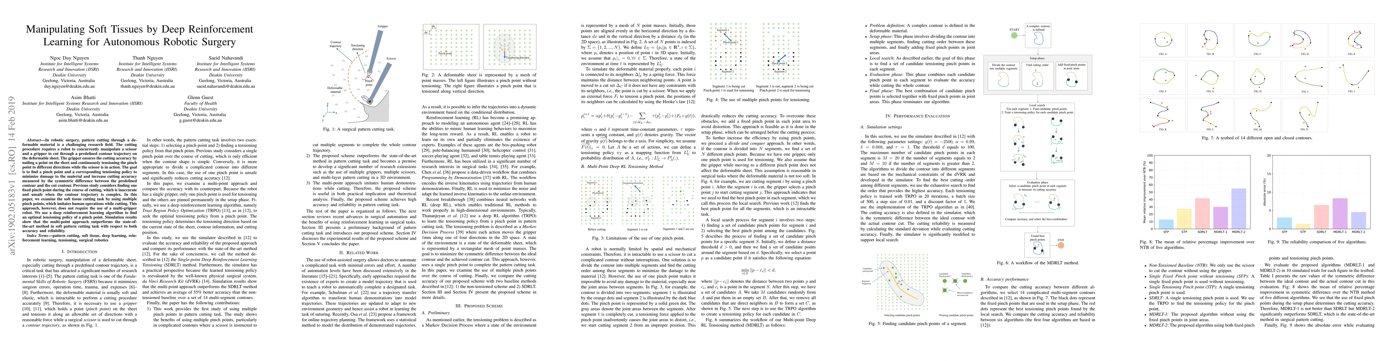 In robotic surgery, pattern cutting through a deformable material is a challenging research field. The cutting procedure requires a robot to concurrently manipulate a scissor and a gripper to cut through a predefined contour trajectory on the deformable sheet. The gripper ensures the cutting accuracy by nailing a point on the sheet and continuously tensioning the pinch point to different directions while the scissor is in action. The goal is to find a pinch point and a corresponding tensioning policy to minimize damage to the material and increase cutting accuracy measured by the symmetric difference between the predefined contour and the cut contour. Previous study considers finding one fixed pinch point during the course of cutting, which is inaccurate and unsafe when the contour trajectory is complex. In this paper, we examine the soft tissue cutting task by using multiple pinch points, which imitates human operations while cutting. This approach, however, does not require the use of a multi-gripper robot. We use a deep reinforcement learning algorithm to find an optimal tensioning policy of a pinch point. Simulation results show that the multi-point approach outperforms the state-of-the-art method in soft pattern cutting task with respect to both accuracy and reliability.