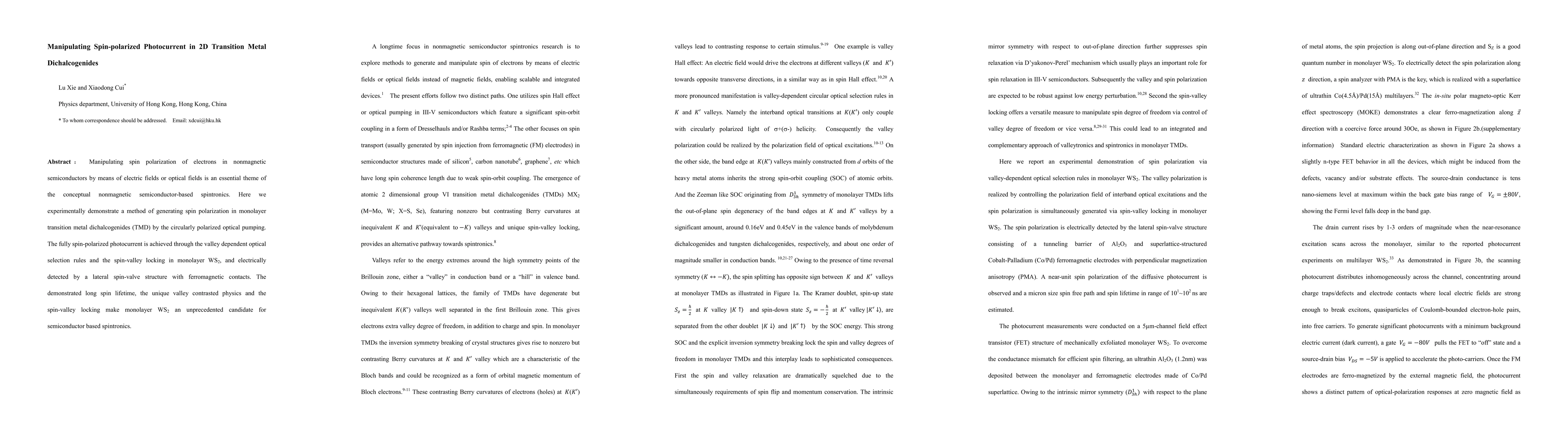 This research demonstrates a method to generate fully spin-polarized photocurrent in monolayer WS2 using circularly polarized optical pumping, leveraging spin-valley locking and valley-dependent optical selection rules, with implications for nonmagnetic semiconductor-based spintronics. The technique utilizes a lateral spin-valve structure with ferromagnetic contacts for detection, highlighting WS2 as a promising material for future spintronic applications.