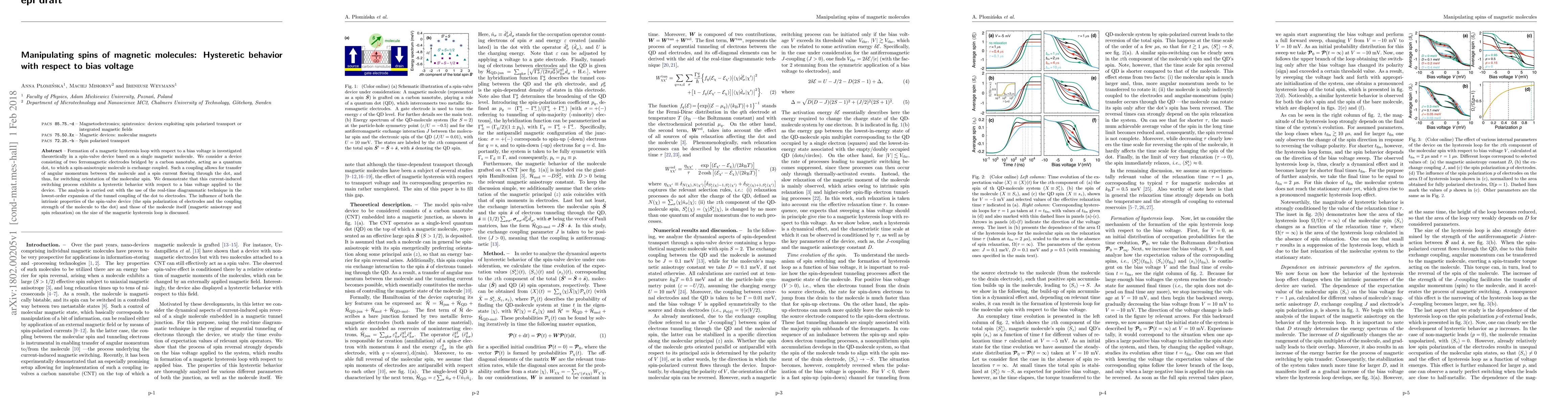 This research investigates theoretically a magnetic hysteresis loop's formation in a spin-valve device with a single magnetic molecule. Using real-time diagrammatic technique, it demonstrates that current-induced molecular spin switching exhibits hysteretic behavior with bias voltage. The study analyzes factors like electrode spin polarization, molecule-dot coupling strength, molecular magnetic anisotropy, and spin relaxation influencing the hysteresis loop size.
