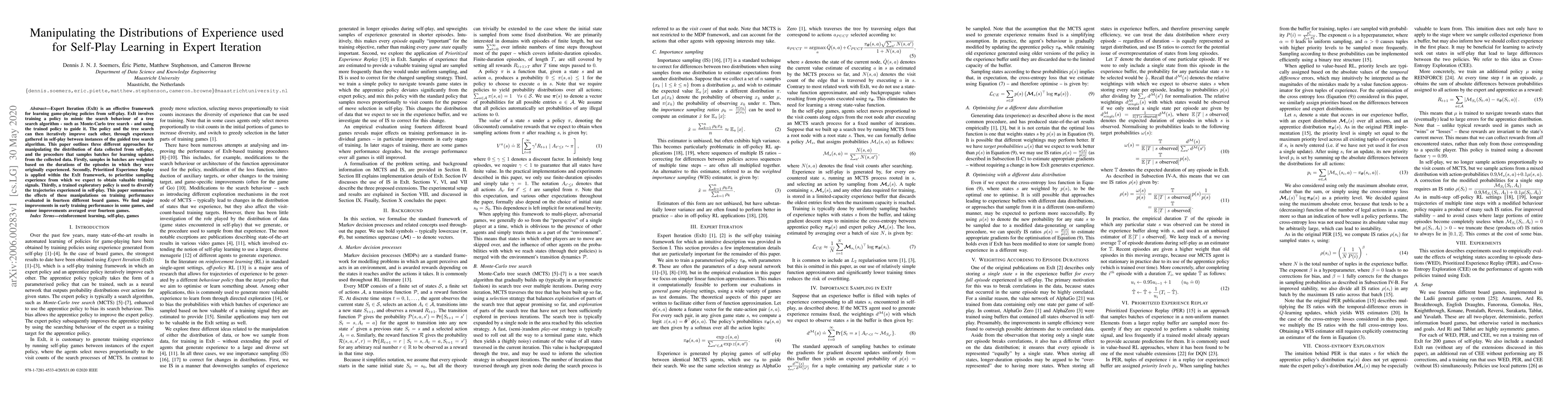 This paper explores three methods to manipulate the experience distribution in Expert Iteration (ExIt) for self-play learning, including episode duration weighting, Prioritized Experience Replay, and an exploratory policy for trajectory diversification. Results show significant early training performance improvements in some games, with minor overall gains across fourteen board games.