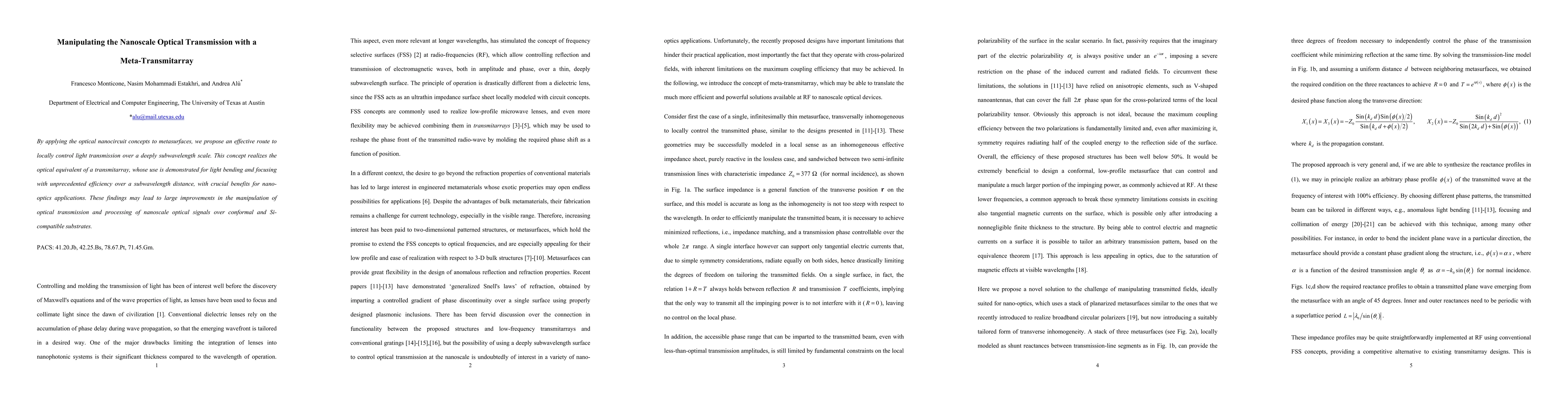 This paper proposes a novel meta-transmitarray to manipulate nanoscale optical transmission, achieving unprecedented efficiency in light bending and focusing over subwavelength distances. The findings hold promise for significant advancements in nano-optics and the processing of nanoscale optical signals on conformal and Si-compatible substrates.
