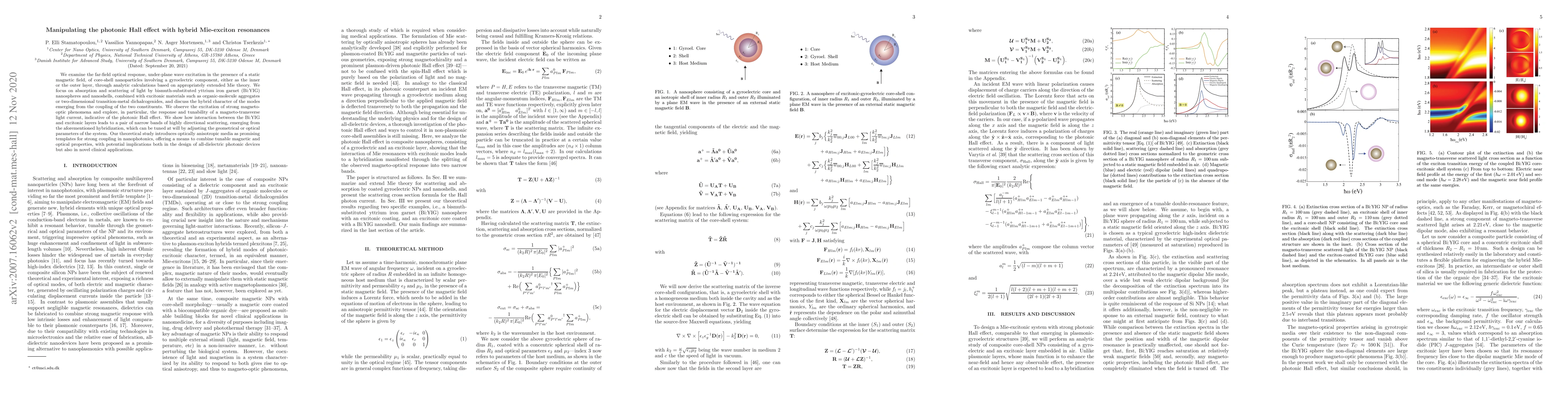 We examine the far-field optical response, under-plane wave excitation in the presence of a static magnetic field, of core-shell nanoparticles involving a gyroelectric component, either as the inner or the outer layer, through analytic calculations based on appropriately extended Mie theory. We focus on absorption and scattering of light by bismuth-substituted yttrium iron garnet (Bi:YIG) nanospheres and nanoshells, combined with excitonic materials such as organic-molecule aggregates or two-dimensional transition-metal dichalcogenides, and discuss the hybrid character of the modes emerging from the coupling of the two constituents. We observe the excitation of strong magneto-optic phenomena and explore, in particular, the response and tunability of a magneto-transverse light current, indicative of the photonic Hall effect. We show how interaction between the Bi:YIG and excitonic layers leads to a pair of narrow bands of highly directional scattering, emerging from the aforementioned hybridization, which can be tuned at will by adjusting the geometrical or optical parameters of the system. Our theoretical study introduces optically anisotropic media as promising templates for strong coupling in nanophotonics, offering a means to combine tunable magnetic and optical properties, with potential implications both in the design of all-dielectric photonic devices but also in novel clinical applications.