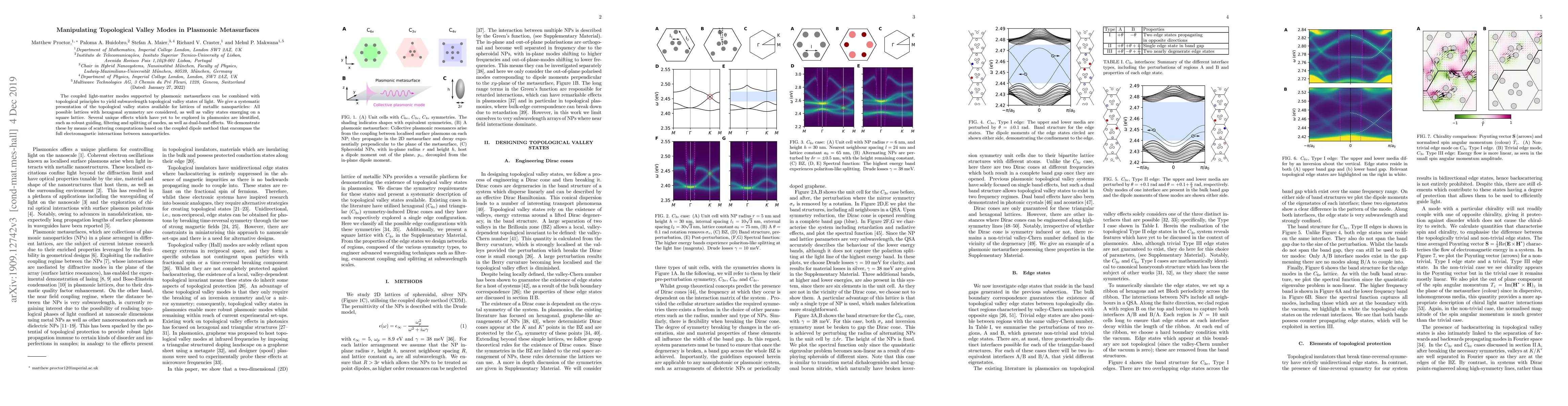 The coupled light-matter modes supported by plasmonic metasurfaces can be combined with topological principles to yield subwavelength topological valley states of light. We give a systematic presentation of the topological valley states available for lattices of metallic nanoparticles: All possible lattices with hexagonal symmetry are considered, as well as valley states emerging on a square lattice. Several unique effects which have yet to be explored in plasmonics are identified, such as robust guiding, filtering and splitting of modes, as well as dual-band effects. We demonstrate these by means of scattering computations based on the coupled dipole method that encompass the full electromagnetic interactions between nanoparticles.