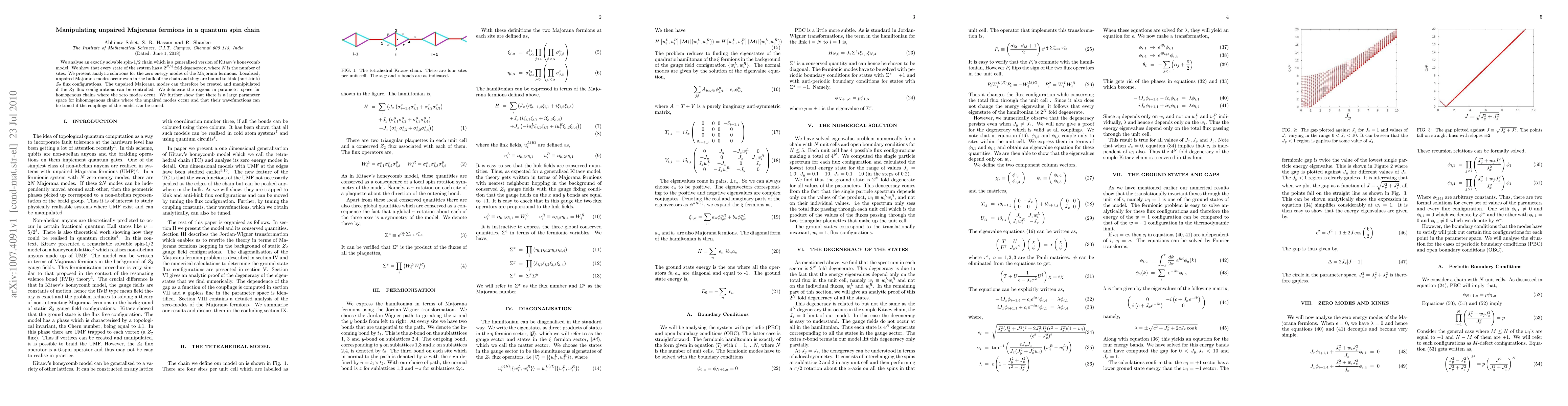We analyse an exactly solvable spin-$1/2$ chain which is a generalised version of Kitaev's honeycomb model. We show that every state of the system has a $2^{N/4}$ fold degeneracy, where $N$ is the number of sites. We present analytic solutions for the zero energy modes of the Majorana fermions. Localised, unpaired Majorana modes occur even in the bulk of the chain and they are bound to kink (anti-kink) $Z_2$ flux configurations. The unpaired Majorana modes can therefore be created and manipiulated if the $Z_2$ flux configurations can be controlled. We delineate the regions in parameter space for homogenous chains where the zero modes occur. We further show that there is a large parameter space for inhomogenous chains where the unpaired modes occur and that their wavefunctions can be tuned if the couplings of the model can be tuned.