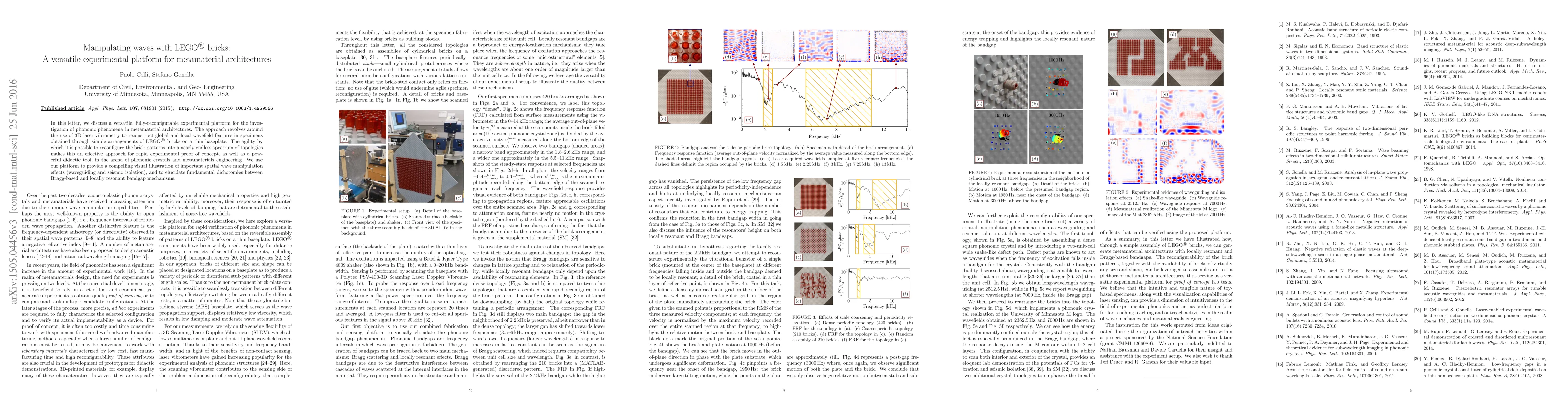In this letter, we discuss a versatile, fully-reconfigurable experimental platform for the investigation of phononic phenomena in metamaterial architectures. The approach revolves around the use of 3D laser vibrometry to reconstruct global and local wavefield features in specimens obtained through simple arrangements of LEGO$^{\circledR}$ bricks on a thin baseplate. The agility by which it is possible to reconfigure the brick patterns into a nearly endless spectrum of topologies makes this an effective approach for rapid experimental proof of concept, as well as a powerful didactic tool, in the arena of phononic crystals and metamaterials engineering. We use our platform to provide a compelling visual illustration of important spatial wave manipulation effects (waveguiding and seismic isolation), and to elucidate fundamental dichotomies between Bragg-based and locally resonant bandgap mechanisms.