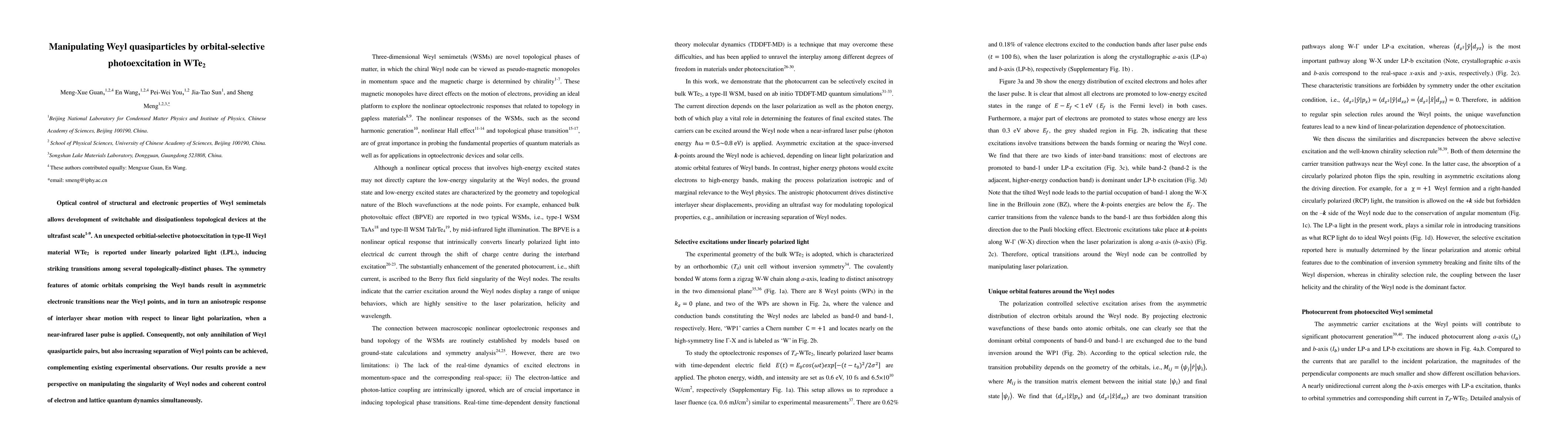 Optical control of structural and electronic properties of Weyl semimetals allows development of switchable and dissipationless topological devices at the ultrafast scale. An unexpected orbitial-selective photoexcitation in type-II Weyl material WTe2 is reported under linearly polarized light (LPL), inducing striking transitions among several topologically-distinct phases. The symmetry features of atomic orbitals comprising the Weyl bands result in asymmetric electronic transitions near the Weyl points, and in turn an anisotropic response of interlayer shear motion with respect to linear light polarization, when a near-infrared laser pulse is applied. Consequently, not only annihilation of Weyl quasiparticle pairs, but also increasing separation of Weyl points can be achieved, complementing existing experimental observations. Our results provide a new perspective on manipulating the singularity of Weyl nodes and coherent control of electron and lattice quantum dynamics simultaneously.