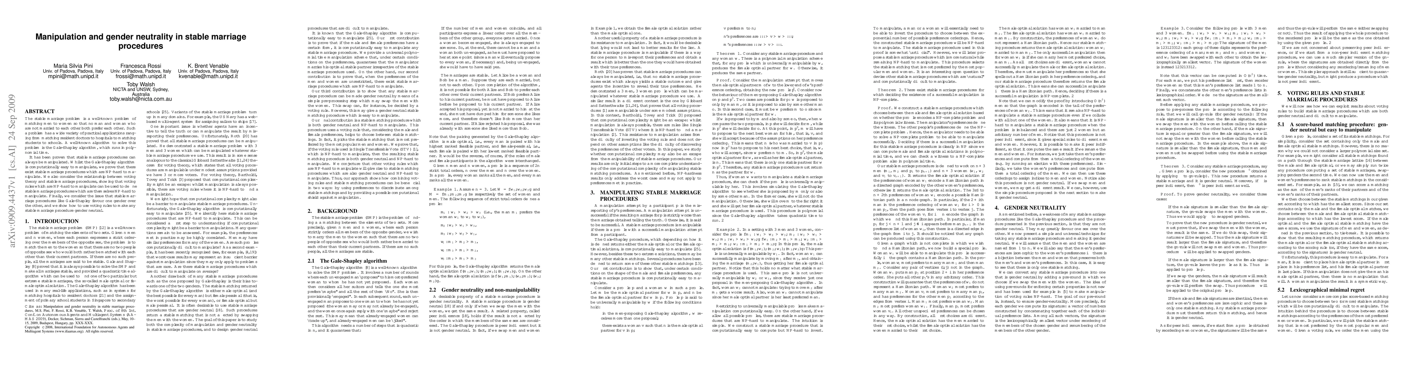 This paper explores the manipulation of stable marriage procedures, proving that while the Gale-Shapley algorithm is easy to manipulate, other procedures can be NP-hard to manipulate. It also addresses gender bias in such procedures and proposes using voting rules to create gender-neutral matching algorithms.