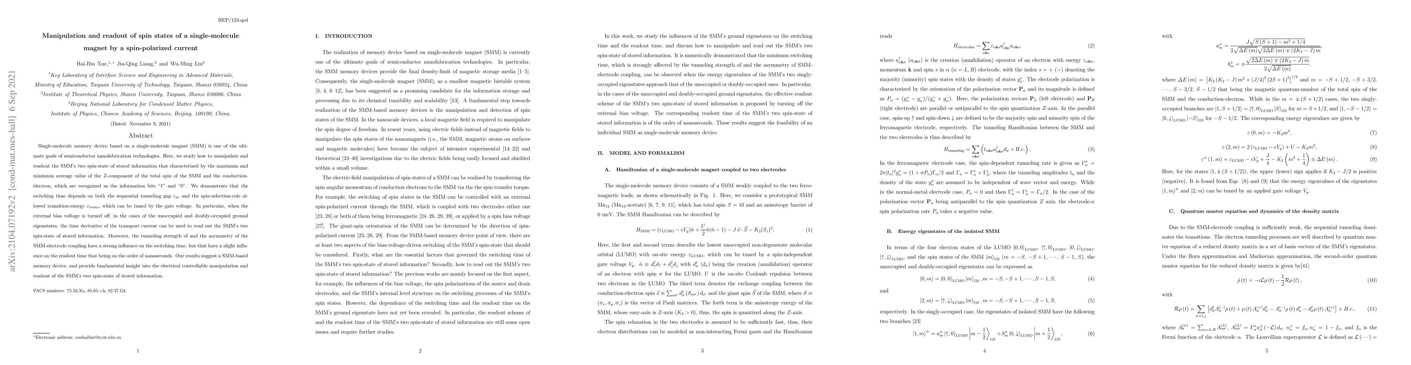 This paper explores the manipulation and readout of spin states in a single-molecule magnet (SMM) memory device using spin-polarized current. The study demonstrates that the switching time is influenced by the tunneling gap and transition energy, which can be controlled via gate voltage, while the readout time remains on the order of nanoseconds.