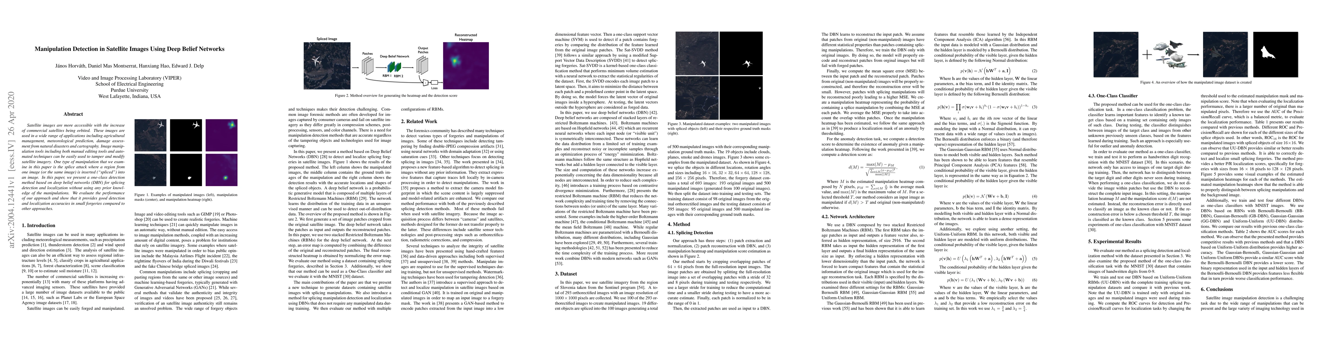 This paper proposes a one-class detection method using deep belief networks (DBN) for detecting and localizing spliced manipulations in satellite images without prior knowledge of the manipulations. The method shows good accuracy in detecting small forgeries compared to other techniques.