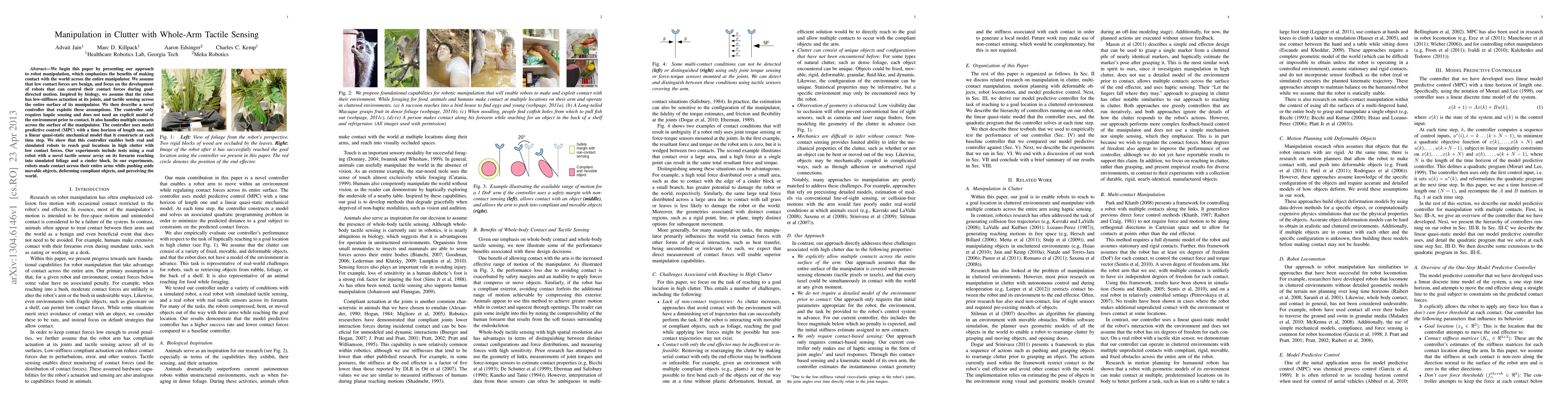 We begin this paper by presenting our approach to robot manipulation, which emphasizes the benefits of making contact with the world across the entire manipulator. We assume that low contact forces are benign, and focus on the development of robots that can control their contact forces during goal-directed motion. Inspired by biology, we assume that the robot has low-stiffness actuation at its joints, and tactile sensing across the entire surface of its manipulator. We then describe a novel controller that exploits these assumptions. The controller only requires haptic sensing and does not need an explicit model of the environment prior to contact. It also handles multiple contacts across the surface of the manipulator. The controller uses model predictive control (MPC) with a time horizon of length one, and a linear quasi-static mechanical model that it constructs at each time step. We show that this controller enables both real and simulated robots to reach goal locations in high clutter with low contact forces. Our experiments include tests using a real robot with a novel tactile sensor array on its forearm reaching into simulated foliage and a cinder block. In our experiments, robots made contact across their entire arms while pushing aside movable objects, deforming compliant objects, and perceiving the world.