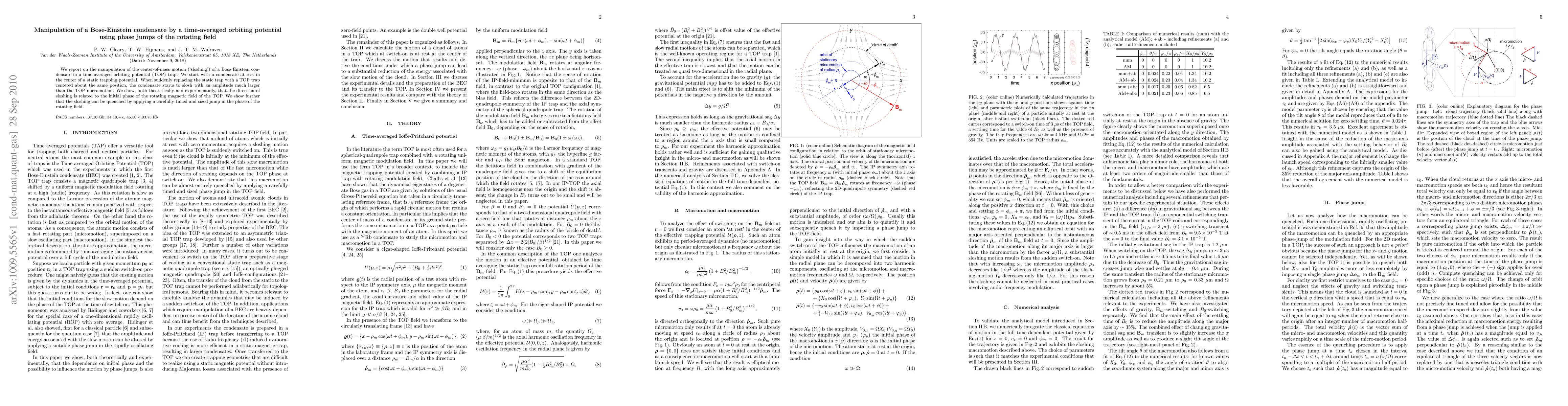 We report on the manipulation of the center-of-mass motion (`sloshing') of a Bose Einstein condensate in a time-averaged orbiting potential (TOP) trap. We start with a condensate at rest in the center of a static trapping potential. When suddenly replacing the static trap with a TOP trap centered about the same position, the condensate starts to slosh with an amplitude much larger than the TOP micromotion. We show, both theoretically and experimentally, that the direction of sloshing is related to the initial phase of the rotating magnetic field of the TOP. We show further that the sloshing can be quenched by applying a carefully timed and sized jump in the phase of the rotating field.