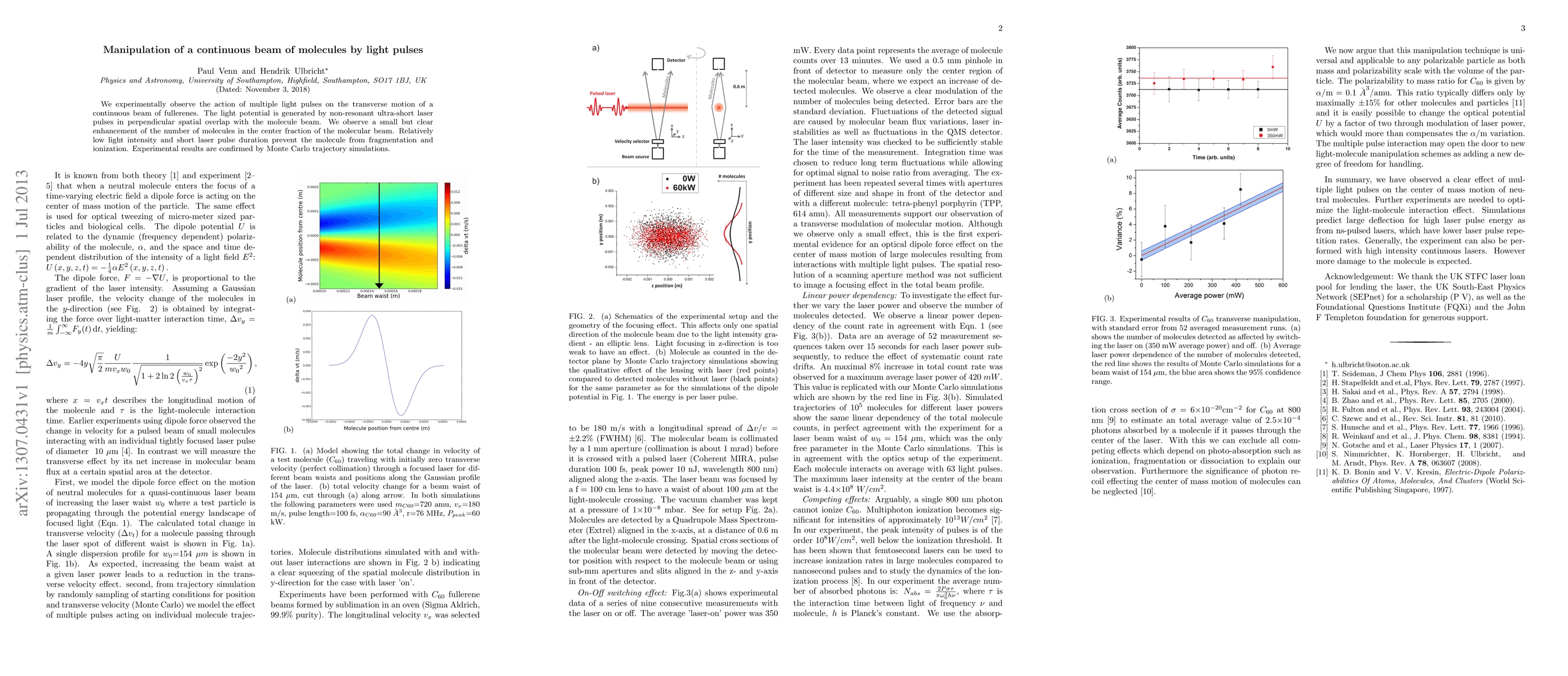 We experimentally observe the action of multiple light pulses on the transverse motion of a continuous beam of fullerenes. The light potential is generated by non-resonant ultra-short laser pulses in perpendicular spatial overlap with the molecule beam. We observe a small but clear enhancement of the number of molecules in the center fraction of the molecular beam. Relatively low light intensity and short laser pulse duration prevent the molecule from fragmentation and ionization. Experimental results are confirmed by Monte Carlo trajectory simulations.