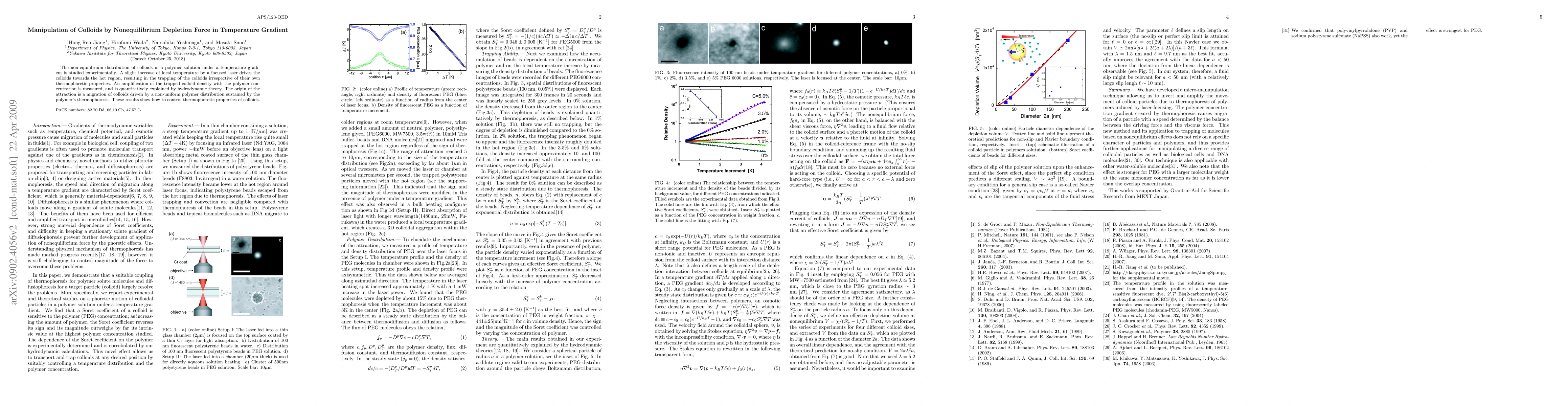 This paper experimentally investigates the nonequilibrium depletion force in a temperature gradient, showing that colloids in a polymer solution can be manipulated by localized heating, leading to their accumulation in the hotter region despite their intrinsic thermophoretic properties. The study quantitatively explains the amplified colloid density with polymer concentration using hydrodynamic theory, attributing the effect to the migration of colloids driven by the non-uniform polymer distribution caused by thermophoresis.