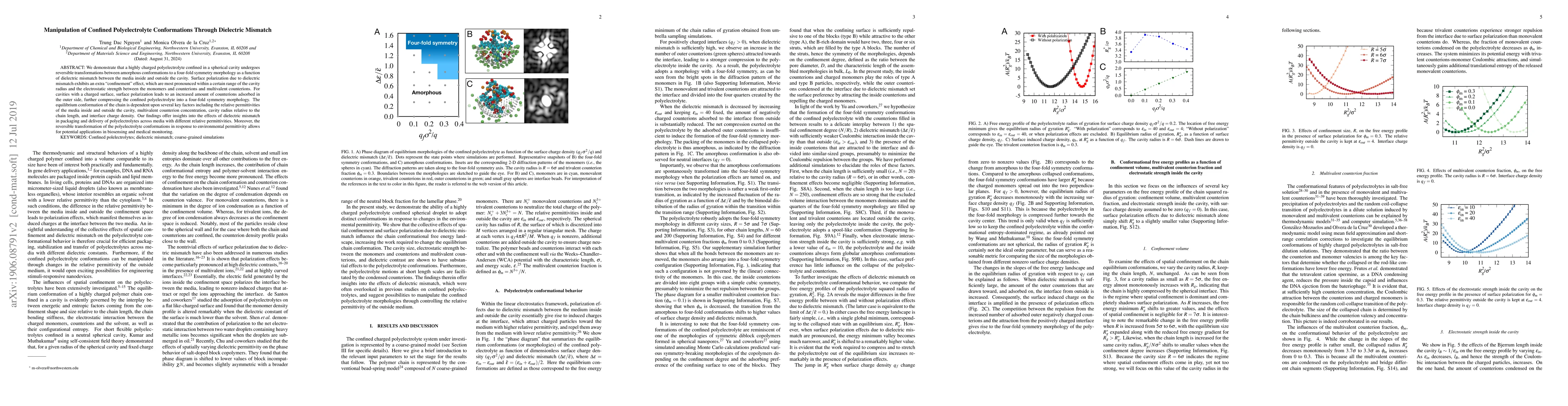 This paper investigates how dielectric mismatch influences the conformation of a highly charged polyelectrolyte confined in a spherical cavity, showing reversible transformations from amorphous to four-fold symmetry. The study highlights the role of surface polarization and various factors like relative permittivities, counterion concentration, and cavity radius in determining the equilibrium conformation, with implications for polyelectrolyte delivery and biosensing.