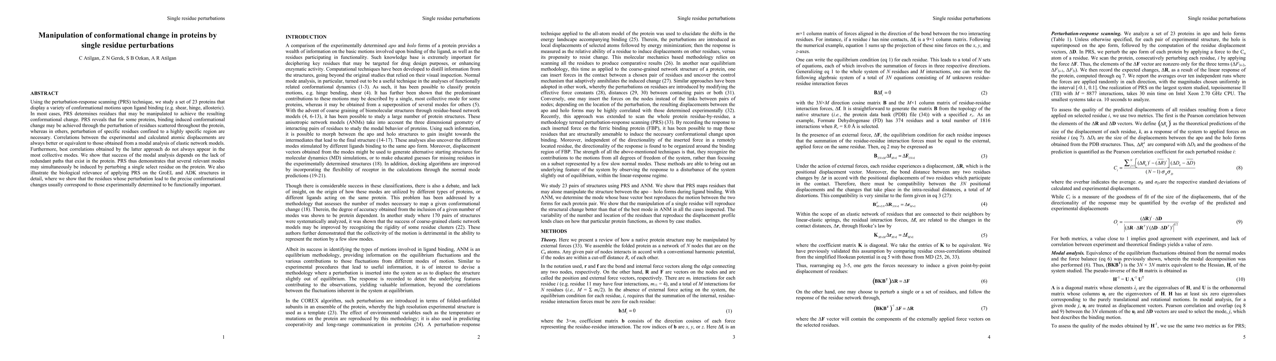 This paper uses perturbation-response scanning (PRS) to identify residues that can manipulate conformational changes in 23 proteins, revealing that some changes require perturbations across the protein, while others need specific localized residues. PRS shows better correlation with experimental data than modal analysis of elastic network models.