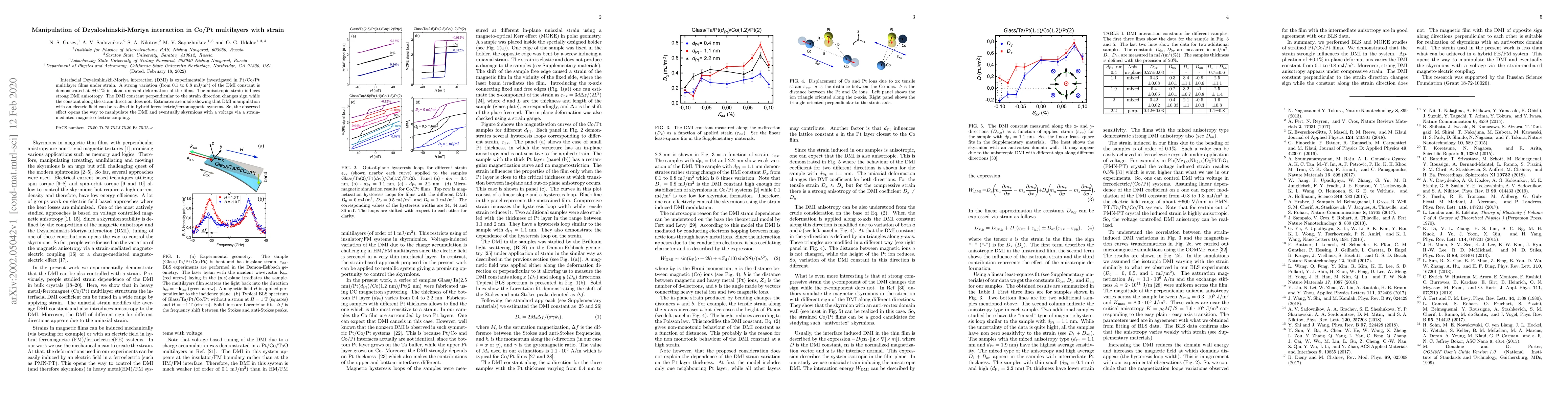 This paper investigates how strain affects the Dzyaloshinskii-Moriya interaction (DMI) in Pt/Co/Pt multilayer films, demonstrating significant DMI variation (from 0.1 to 0.8 mJ/m²) under small in-plane uniaxial deformations. The study reveals that strain can manipulate DMI anisotropy, potentially enabling voltage-controlled DMI and skyrmion manipulation through magneto-electric coupling.