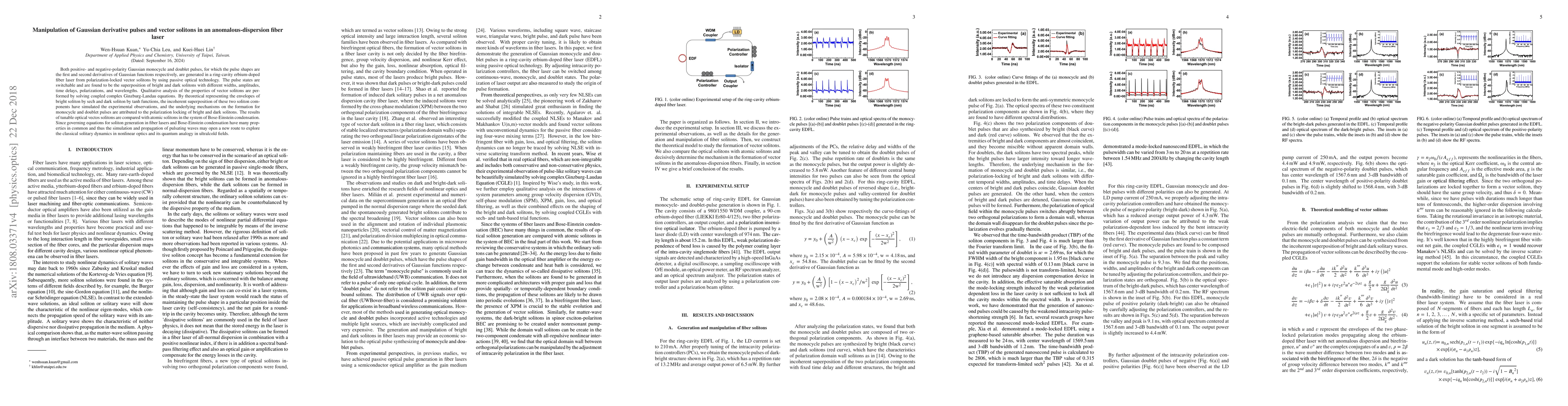 Both positive- and negative-polarity Gaussian monocycle and doublet pulses, for which the pulse shapes are the first and second derivatives of Gaussian functions respectively, are generated in a ring-cavity erbium-doped fiber laser from polarization-locked vector solitons by using passive optical technology. The pulse states are switchable and are found to be the superposition of bright and dark solitons with different widths, amplitudes, time delays, polarizations, and wavelengths. Qualitative analysis of the properties of vector solitons are performed by solving coupled complex Ginzburg-Landau equations. By theoretical representing the envelopes of bright soliton by sech and dark soliton by tanh functions, the incoherent superposition of these two soliton components have simulated the experimental observations, and the underlying mechanisms on the formation for monocycle and doublet pulses are attributed to the polarization locking of bright and dark solitons. The results of tunable optical vectos solitons are compared with atomic solitons in the system of Bose-Einstein condensation. Since governing equations for soliton generation in fiber lasers and Bose-Einstein condensation have many properties in common and thus the simulation and propagation of pulsating waves may open a new route to explore the classical solitary dynamics in nonlinear optics and its quantum analogy in ultralcold fields.
