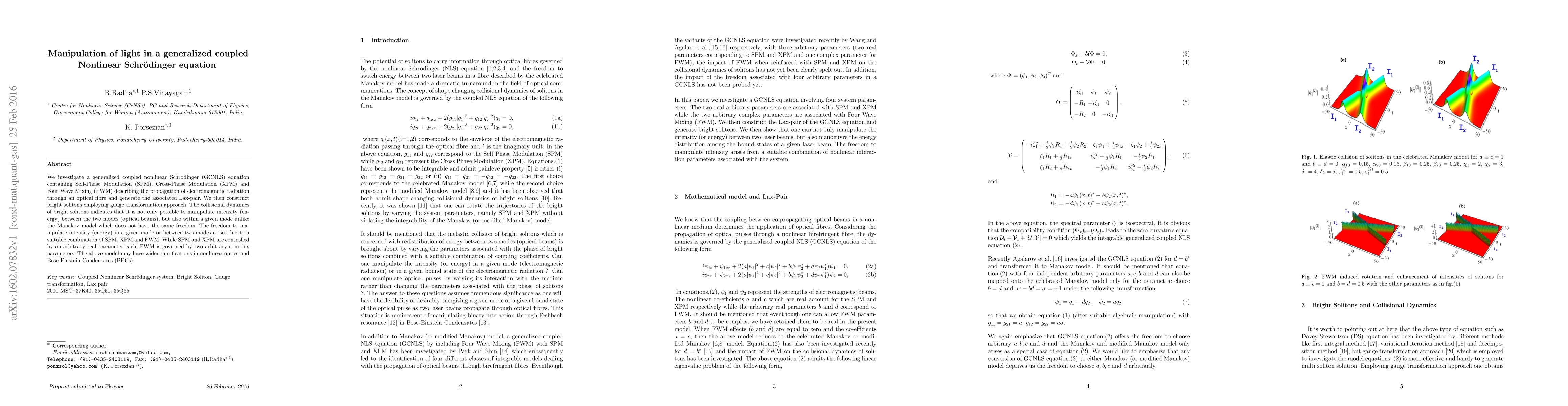 This paper explores a generalized coupled nonlinear Schrödinger equation incorporating Self-Phase Modulation, Cross-Phase Modulation, and Four Wave Mixing to describe light propagation in optical fibers. It constructs bright solitons using a gauge transformation and demonstrates the ability to manipulate intensity between and within optical modes, offering broader implications for nonlinear optics and Bose-Einstein Condensates.