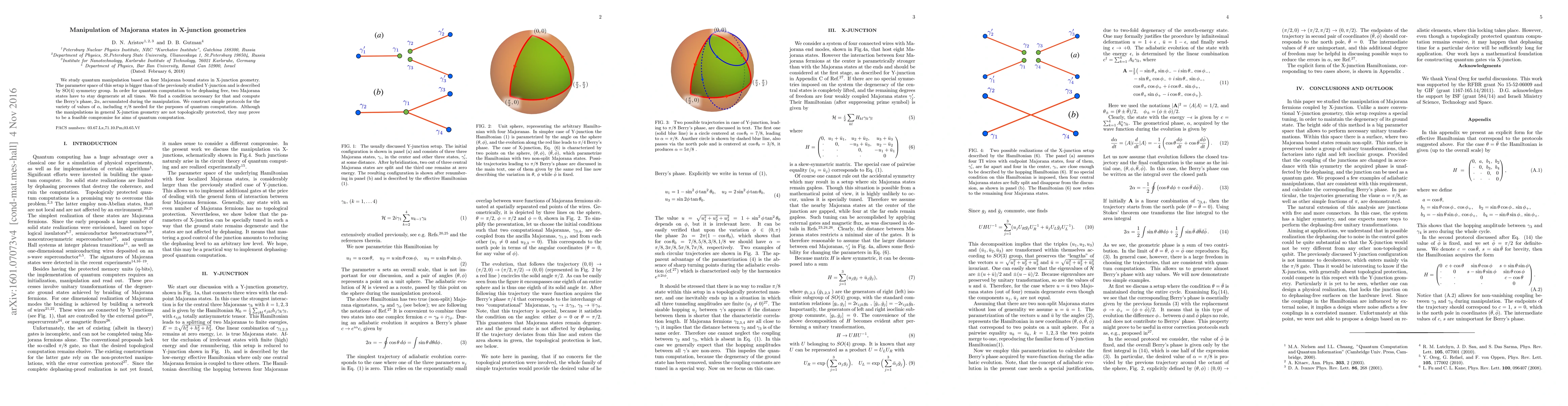 We study quantum manipulation based on four Majorana bound states in X-junction geometry. The parameter space of this setup is bigger than of the previously studied Y-junction and is described by SO(4) symmetry group. In order for quantum computation to be dephasing free, two Majorana states have to stay degenerate at all times. We find a condition necessary for that and compute the Berry's phase, $2\alpha$, accumulated during the manipulation. We construct simple protocols for the variety of values of $\alpha$, including $\pi/8$ needed for the purposes of quantum computation. Although the manipulations in general X-junction geometry are not topologically protected, they may prove to be a feasible compromise for aims of quantum computation.