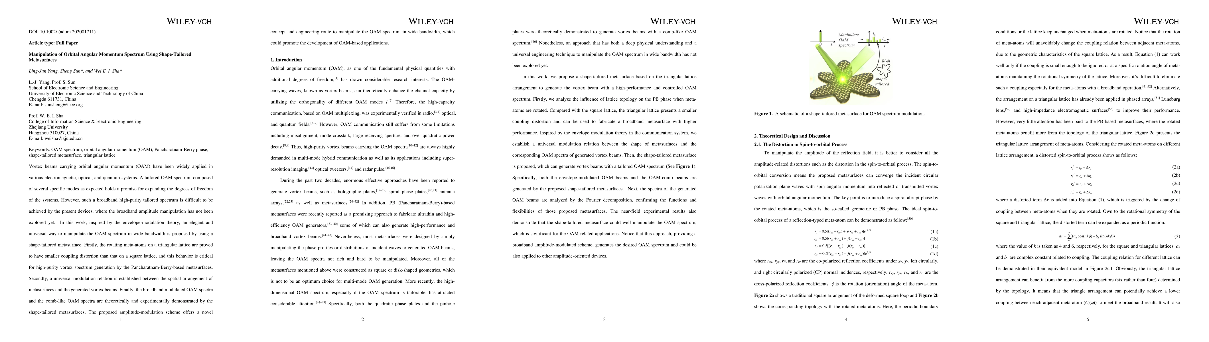 This paper proposes a universal method for manipulating the orbital angular momentum (OAM) spectrum in a wide bandwidth using shape-tailored metasurfaces. It demonstrates that rotating meta-atoms on a triangular lattice reduce coupling distortion, facilitating high-purity vortex spectrum generation and achieves broadband modulation of OAM spectra.