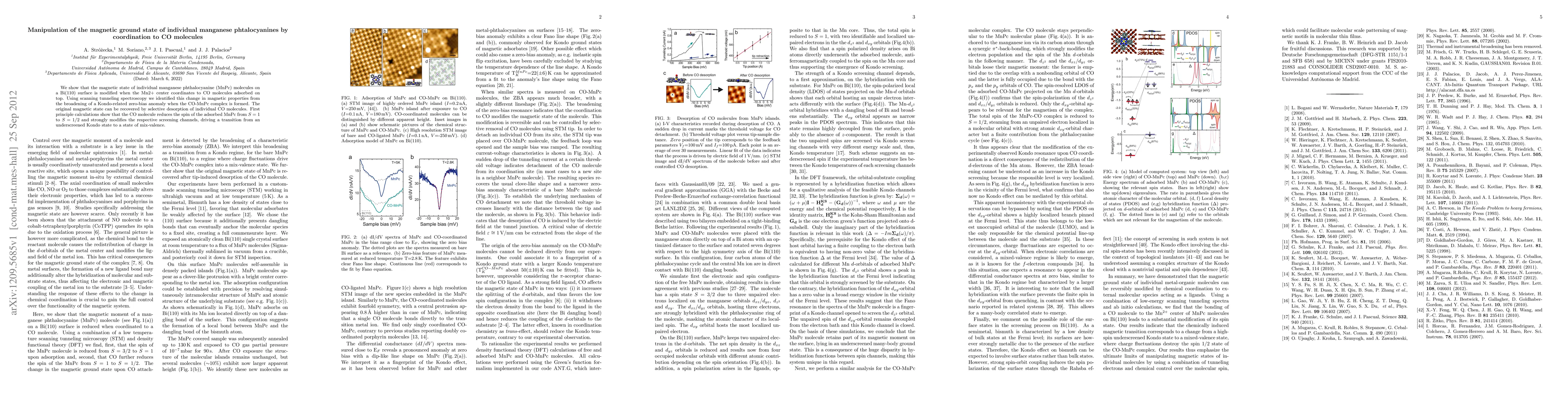This study demonstrates that the magnetic state of manganese phthalocyanine molecules on a Bi(110) surface can be manipulated by coordinating CO molecules, altering the spin from S = 1 to S = 1/2, and shifting the magnetic properties via scanning tunneling spectroscopy. The original magnetic state can be restored by selectively removing CO molecules.